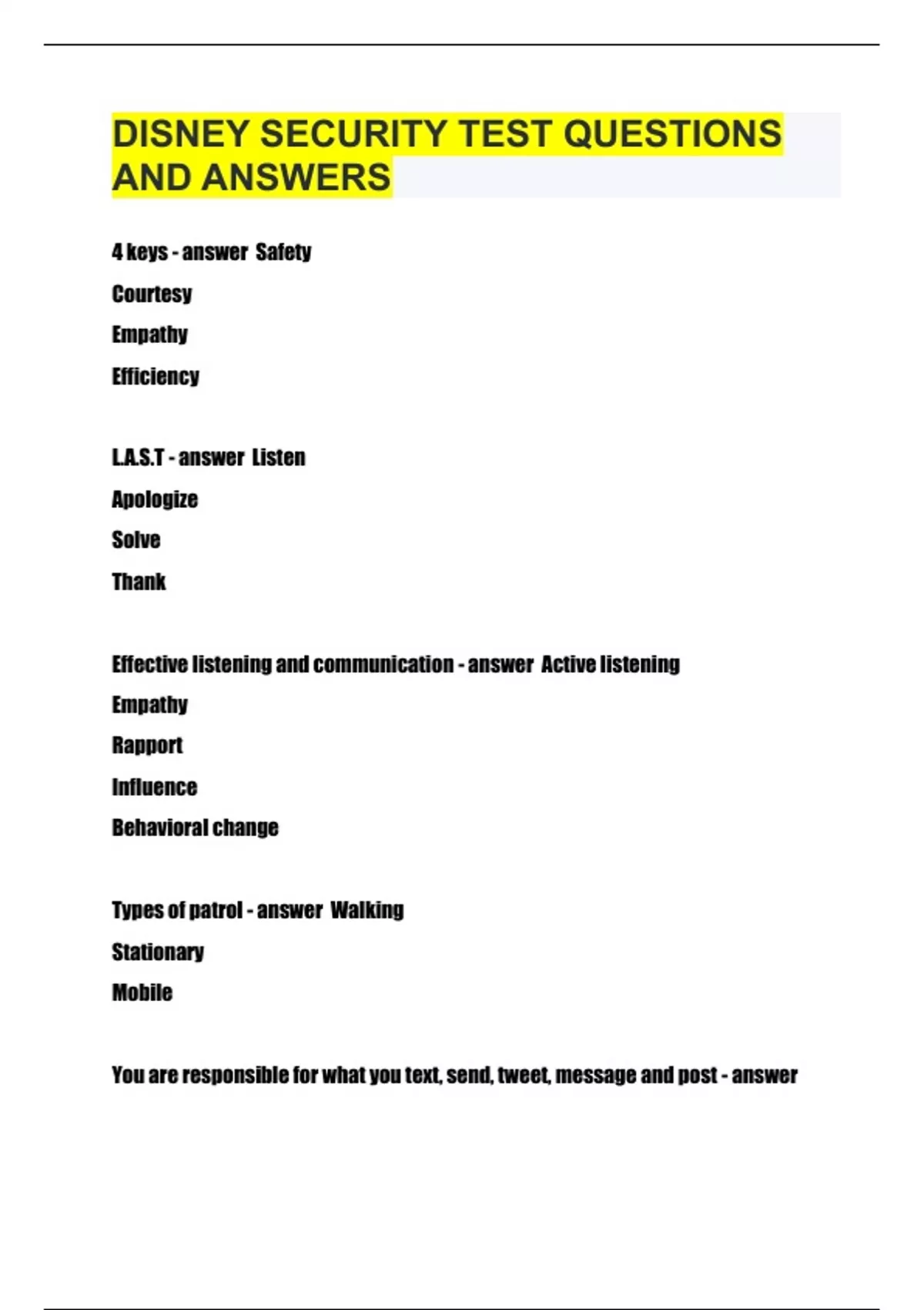 DISNEY SECURITY TEST QUESTIONS AND ANSWERS.
