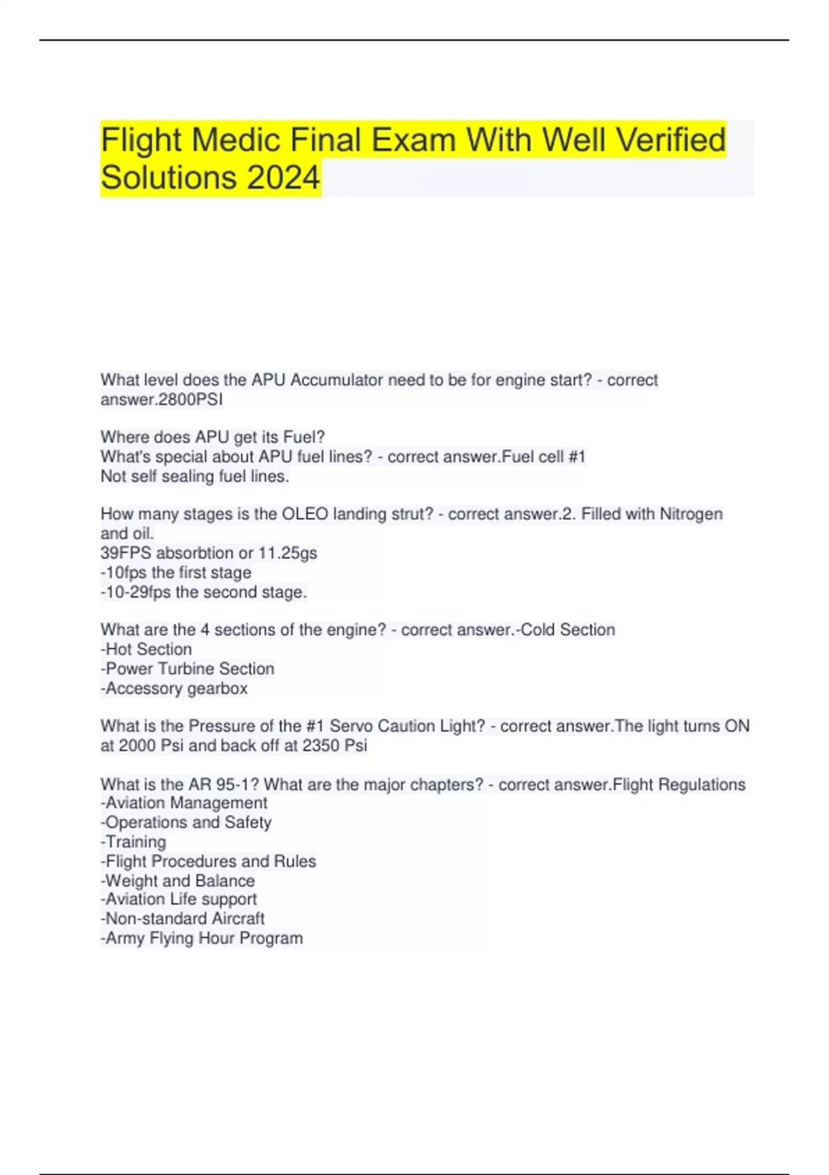 Flight Medic Final Exam With Well Verified Solutions 2024 What level does the APU Accumulator need to be for engine start? - correct answer.2800PSI Where does APU get its Fuel? What's special about APU fuel lines? - correct answer.Fuel cell #1 Not self sealing fuel lines. How many stages is the OLEO landing strut? - correct answer.2. Filled with Nitrogen and oil. 39FPS absorbtion or 11.25gs -10fps the first stage -10-29fps the second stage. What are the 4 sections of the engine? - correct answer.-Cold Section -Hot Section -Power Turbine Section -Accessory gearbox What is the Pressure of the #1 Servo Caution Light? - correct answer.The light turns ON at 2000 Psi and back off at 2350 Psi What is the AR 95-1? What are the major chapters? - correct answer.Flight Regulations -Aviation Management -Operations and Safety -Training -Flight Procedures and Rules -Weight and Balance -Aviation Life support -Non-standard Aircraft -Army Flying Hour Program Difference between CASEVAC vs. MEDEVAC? - correct answer.MEDEVAC - Medical Evacuation using a dedicated Medical platform CASEVAC - Casualty Evacuation using a non-medical Platform Difference between Combat Support Hospital vs. Forward Surgical Team? - correct answer.-FST Small mobile surgical units and can stand alone or support elements. Role 2 -CASH capable of providing definitive care for many cases, further back from front line. Role 3 Where is the placement for the Needle Chest Decompression? - correct answer.Primary -2nd intercostal space, mid-clavicular line on affected side Secondary -4th ICS mid-axillary / anterior-axillary line What is stated in AR 95-1 concerning Litter Patients? - correct answer.Patients on litter will be restrained by litter restraining straps during takeoffs, landings, and turbulence. Subjective VS. Objective Information? - correct answer.-A SUBJECTIVE point of view is a personal view or opinion -OBJECTIVE Point of View gives only facts What Is CCT? - correct answer.Color, Condition, Temperature of the skin which are early indications whether or not a patient is going into shock. Simple Pneumo vs. Tension Pneumo? - correct answer.-Abnormal collection of air in the pleural space, eventually can cause a one-way valve to form trapping more and more air collapsing a lung.