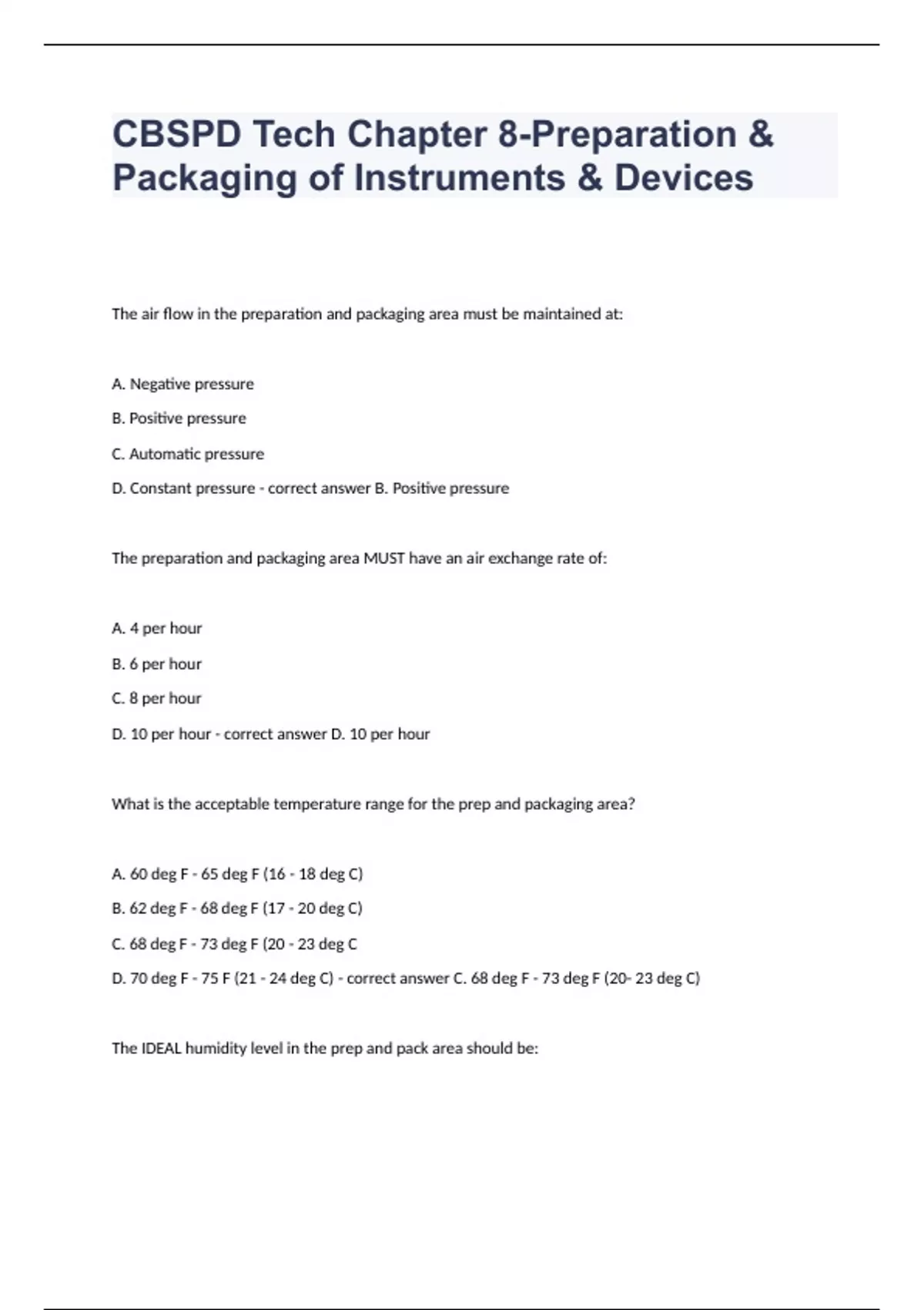 CBSPD Tech Chapter 8-Preparation & Packaging of Instruments & DevicesThe air flow in the preparation and packaging area must be maintained at: A. Negative pressure B. Positive pressure C. Automatic pressure D. Constant pressure - correct answer B. Positive pressure The preparation and packaging area MUST have an air exchange rate of: A. 4 per hour B. 6 per hour C. 8 per hour D. 10 per hour - correct answer D. 10 per hour What is the acceptable temperature range for the prep and packaging area? A. 60 deg F - 65 deg F (16 - 18 deg C) B. 62 deg F - 68 deg F (17 - 20 deg C) C. 68 deg F - 73 deg F (20 - 23 deg C D. 70 deg F - 75 F (21 - 24 deg C) - correct answer C. 68 deg F - 73 deg F (20- 23 deg C) The IDEAL humidity level in the prep and pack area should be: A. 50% B. 40% C. 20% D. 35% - correct answer A. 50% If a non-perforated tray is used for the sterilization of instrument sets, it MUST be: A. Laid flat on the sterilizer rack B. Wrapped with a towel prior to placing the instruments on it C. Processed on the top rack of the sterilizer D. Tilted on the sterilizer rack - correct answer D. Tilted on the sterilizer rack The floors in the preparation area should be: A. Wet-mopped daily B. Dry-mopped each shift C. Swept with a broom on the night shift D. Vacuumed once a week - correct answer A. Wet-mopped daily Where should the heavier instruments be placed when assembling a set containing heavy and delicate instruments? A. In the center of the tray B. On the top of the delicate instruments C. On the bottom of the set D. On the right hand side - correct answer C. On the bottom of the set Which of the following can be done to aid in the drying of wrapped instrument sets?