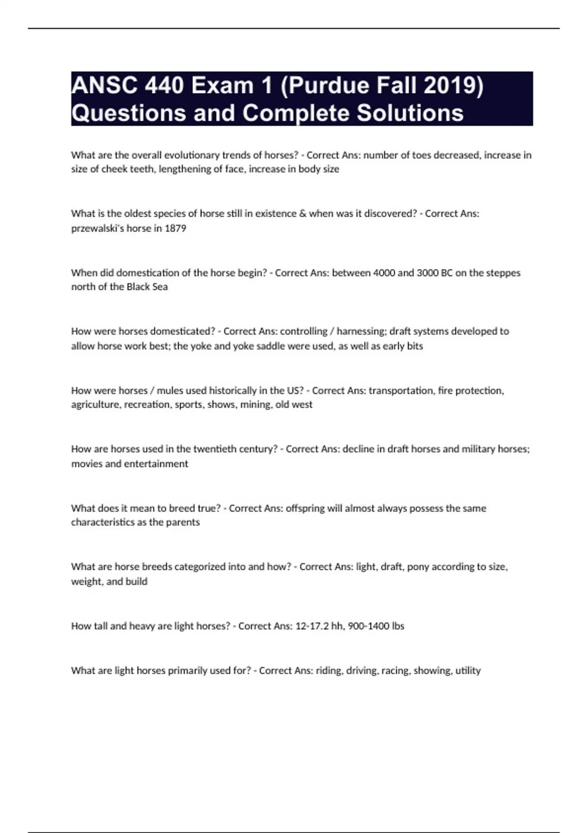 ANSC 440 Exam 1 (Purdue Fall 2019) Questions and Complete Solutions What are the overall evolutionary trends of horses? - Correct Ans: number of toes decreased, increase in size of cheek teeth, lengthening of face, increase in body size What is the oldest species of horse still in existence & when was it discovered? - Correct Ans: przewalski's horse in 1879 When did domestication of the horse begin? - Correct Ans: between 4000 and 3000 BC on the steppes north of the Black Sea How were horses domesticated? - Correct Ans: controlling / harnessing; draft systems developed to allow horse work best; the yoke and yoke saddle were used, as well as early bits How were horses / mules used historically in the US? - Correct Ans: transportation, fire protection, agriculture, recreation, sports, shows, mining, old west How are horses used in the twentieth century? - Correct Ans: decline in draft horses and military horses; movies and entertainment What does it mean to breed true? - Correct Ans: offspring will almost always possess the same characteristics as the parents What are horse breeds categorized into and how? - Correct Ans: light, draft, pony according to size, weight, and build How tall and heavy are light horses? - Correct Ans: 12-17.2 hh, 900-1400 lbs What are light horses primarily used for? - Correct Ans: riding, driving, racing, showing, utility How do light horses compare to draft? - Correct Ans: more action + greater speed How tall and heavy are draft horses? - Correct Ans: 14.2-17.2 hh, 1400 lbs + What are draft horses primarily used for? - Correct Ans: heavy work or pulling loads How tall and heavy are ponies? - Correct Ans: 14.2 hh or less, 500-900 lbs Which type of horse is fine boned and suitable for riding? - Correct Ans: warmblood Which type of horse is heavy, solid, and strong with a calm temperament? - Correct Ans: coldblood (another way to describe draft horses) How many breeds exist worldwide? - Correct Ans: about 300 What differs between breeds? - Correct Ans: size, conformation, color, and function What are wild horses? - Correct Ans: horses that were once domesticated and have become wild (feral or mustangs) What are the draft horse breeds? - Correct Ans: clydesdale, belgian, percheron, shire, suffolk punch Which draft horse originated in Glasgow, Scotland? - Correct Ans: Clydesdale Which draft horse originated in the west European lowlands of Belgium? - Correct Ans: Belgian Which draft horse was the first draft breed to come to America? - Correct Ans: Percheron Which draft horse originated in the east central English counties of Lincolnshire and Cambridgeshire? - Correct Ans: Shire Which draft horse originated in the eastern English counties of Norfolk and Suffolk? - Correct Ans: Suffolk Punch Which draft horse was the only draft horse bred exclusively for farming? - Correct Ans: Suffolk Punch Which draft horse is most numerous? - Correct Ans: Belgian When did horse bones found associated with human sites increase, along with the age of the horses from which they came? What did this indicate? - Correct Ans: 55,000; Neandethals developed more sophisticated hunting methods