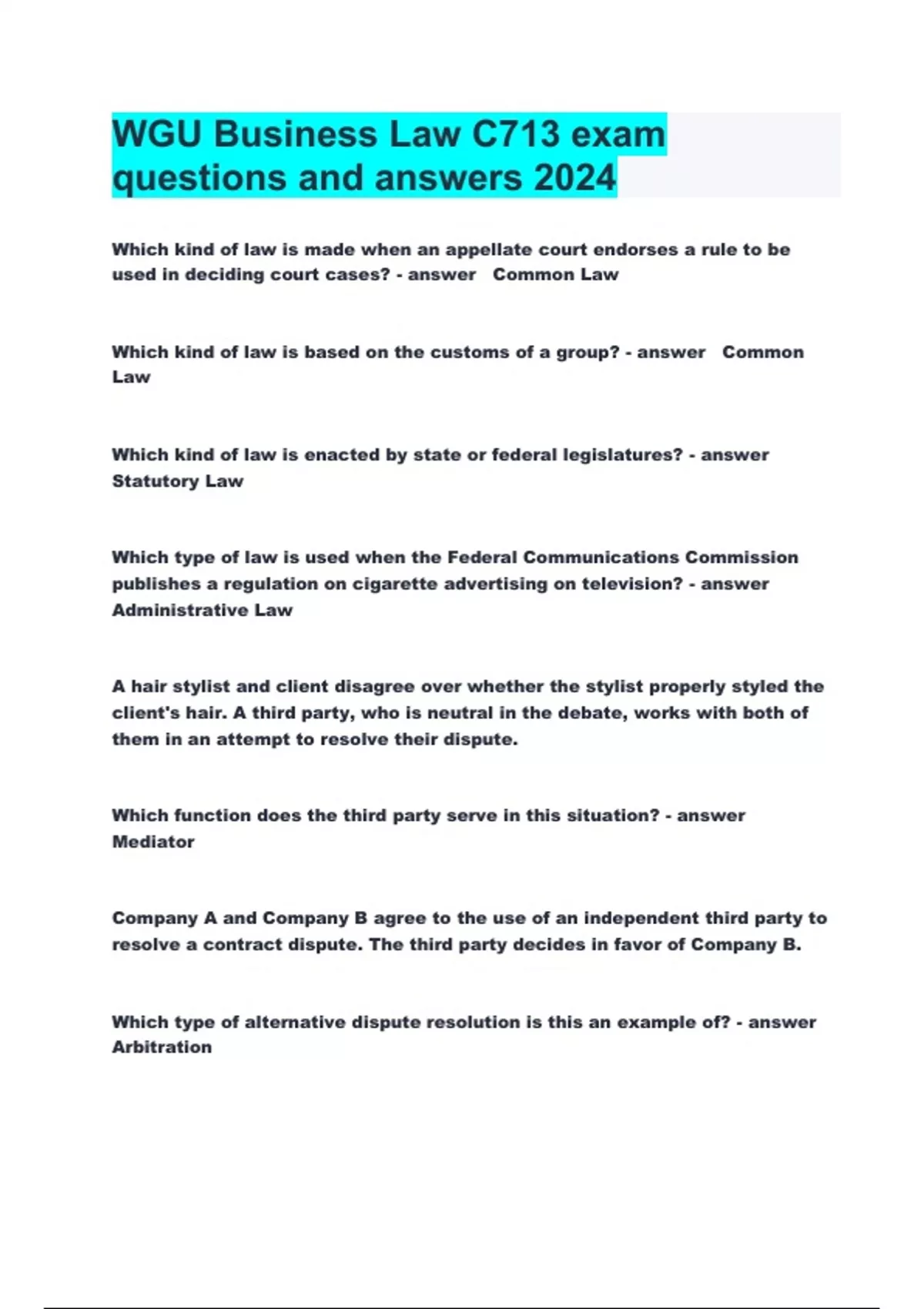 Which kind of law is made when an appellate court endorses a rule to be used in deciding court cases? Common Law Which kind of law is based on the customs of a group? Common Law Which kind of law is enacted by state or federal legislatures? Statutory Law Which type of law is used when the Federal Communications Commission publishes a regulation on cigarette advertising on television? Administrative Law A hair stylist and client disagree over whether the stylist properly styled the client's hair. A third party, who is neutral in the debate, works with both of them in an attempt to resolve their dispute. Which function does the third party serve in this situation? Mediator Company A and Company B agree to the use of an independent third party to resolve a contract dispute. The third party decides in favor of Company B. Which type of alternative dispute resolution is this an example of? Arbitration Which court's main function is to be the final arbiter of all federal laws created by Congress? Supreme What is a primary advantage of alternative dispute resolution (ADR)? It saves time and money True or False In a criminal case, the prosecution must prove all elements beyond a reasonable doubt to convict the defendant. True For many years, the United States engaged in discussions with friendly nations as to the reciprocal use of ports and harbors. These discussions led to various multilateral agreements between the nations as to the configuration of oceangoing vessels and how they would be piloted. At the same time, concern over oil spills in Puget Sound led the state of Washington to impose fairly strict standards on oil tankers and requirements for the training of oil tanker pilots. In addition, Washington's state law imposed many other requirements that went above and beyond agreed-upon requirements in the international agreements negotiated by the federal government. Are the Washington state requirements preempted by federal law? Yes Where does the burden of proof lie in a civil case? The plaintiff must produce a preponderance of evidence. A local vendor sells potato chips and is charged with violating a state law that states "no citizen may sell potato chips anywhere in the state." The federal government, however, has established the "Anti-Potato Sales Act," which prohibits the sale of potatoes in any form. Which action can the vendor take? The vendor must abide by the state law because that is the state from which they operate. What is a form of due process that holds that certain rights are so fundamental that the government may not eliminate them? Substantive due process What is a tort? A private wrong Money given to victims that can include a replacement of property, lost wages, and medical expenses is called what? Compensatory Damages Additional payment used to deter others from similar conduct is called what? Punitive Damages In a work parking garage, a recently terminated employee approaches his boss and verbally mocks him. The boss punches the employee in the face, knocking him out. Later, the employee sues the boss for assault. The boss claims it was self-defense as his life was threatened by the employee. The boss's defense was valid. False