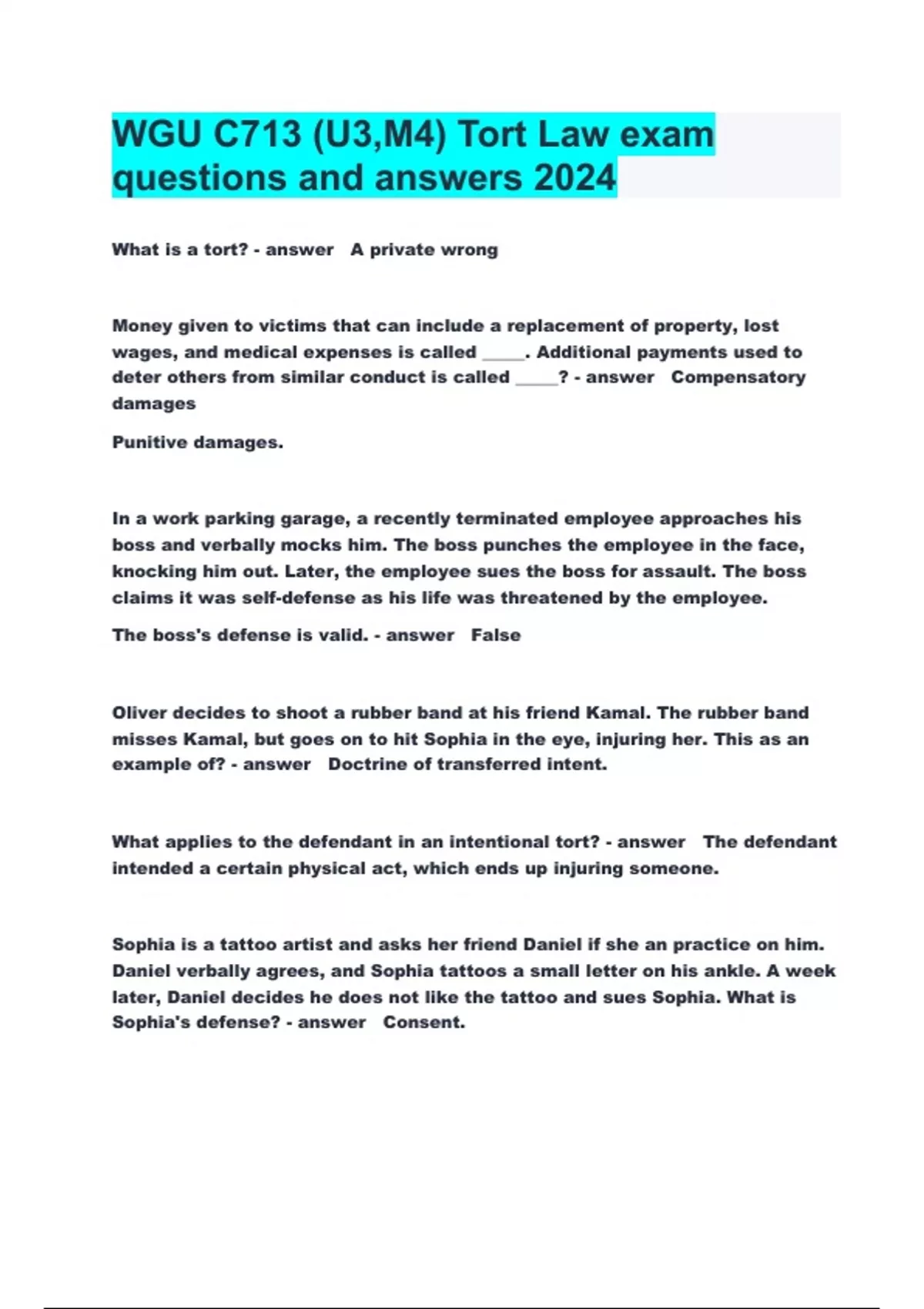 WGU C713 (U3,M4) Tort Law exam questions and answers 2024