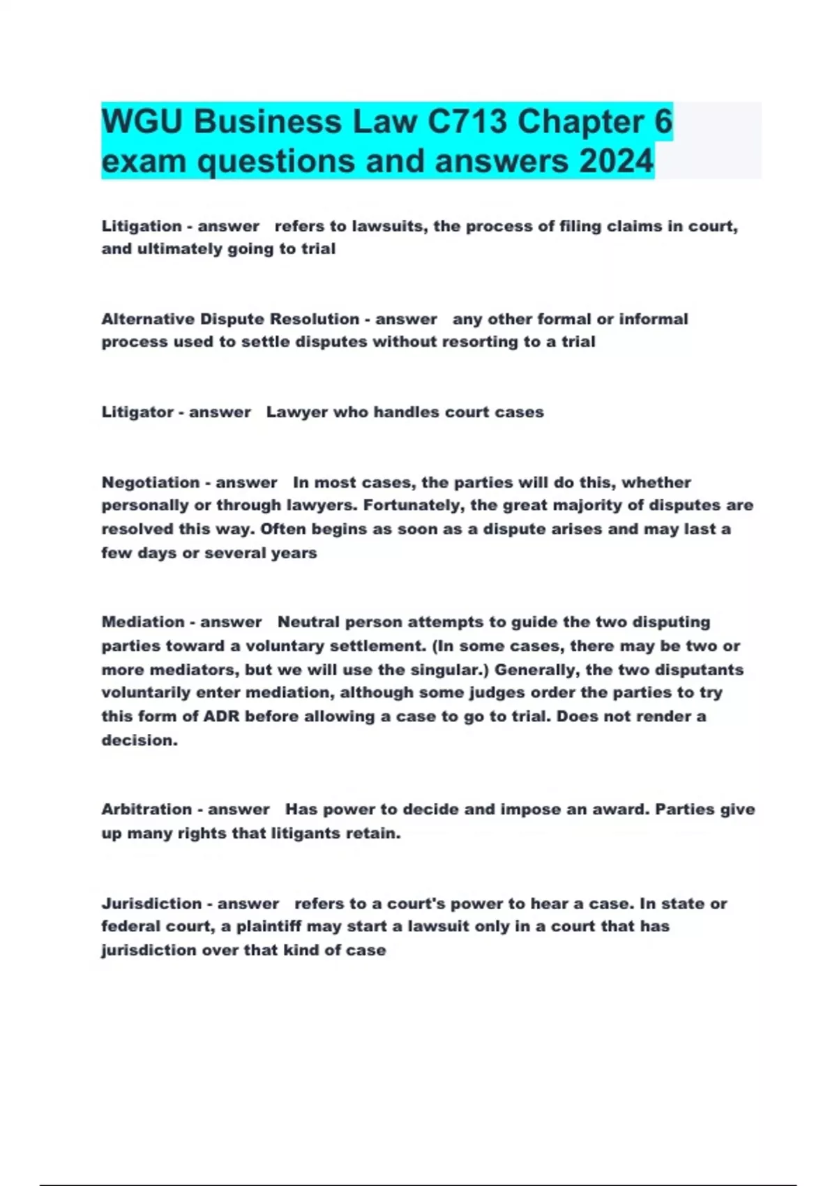 Litigation refers to lawsuits, the process of filing claims in court, and ultimately going to trial Alternative Dispute Resolution any other formal or informal process used to settle disputes without resorting to a trial Litigator Lawyer who handles court cases Negotiation In most cases, the parties will do this, whether personally or through lawyers. Fortunately, the great majority of disputes are resolved this way. Often begins as soon as a dispute arises and may last a few days or several years Mediation Neutral person attempts to guide the two disputing parties toward a voluntary settlement. (In some cases, there may be two or more mediators, but we will use the singular.) Generally, the two disputants voluntarily enter mediation, although some judges order the parties to try this form of ADR before allowing a case to go to trial. Does not render a decision. Arbitration Has power to decide and impose an award. Parties give up many rights that litigants retain. Jurisdiction refers to a court's power to hear a case. In state or federal court, a plaintiff may start a lawsuit only in a court that has jurisdiction over that kind of case Appellate Courts Generally accept the fact given to them by trial courts and review the trial record to see if the court made errors of law State Court System Pyramid : State Supreme court at the top, appeal courts and then other divisions below. IE, Small claims, juvenile division, etc Federal Court System Established by the US Constitution. Limits what kind of cases can be brought in. Steps involved in Beginning Litigation Pleadings, plaintiff files a complaint, summons is served Pleadings Documents that begin a lawsuit. Consist of the complaint, the answer and sometimes the reply. Civil Laws Permitted in Federal Court Federal question cased and diversity cases Discovery Process that allows lawyers to see the opponent's documents and question it's witness Counterclaim A second lawsuit by the defendant again the plaintiff Summary Judgment A ruling by the court that no trial is necessary because there are no essential facts in the dispute Preponderance of Evidence The plaintiff's burden of the proof in a civil lawsuit Beyond a Reasonable Doubt The government's burden of proof in a criminal prosecution Motion for Directed Verdict A ruling that the plaintiff has entirely failed to prove some aspect of their case. Default Judgement A decision that the plaintiff wins without trial because the defendant failed to answer in time Class Action One plaintiff represents the entire group of plaintiffs, including those who were unaware that they were harmed. Complaint Statement of facts plaintiff is alleging and the legal claims they are making