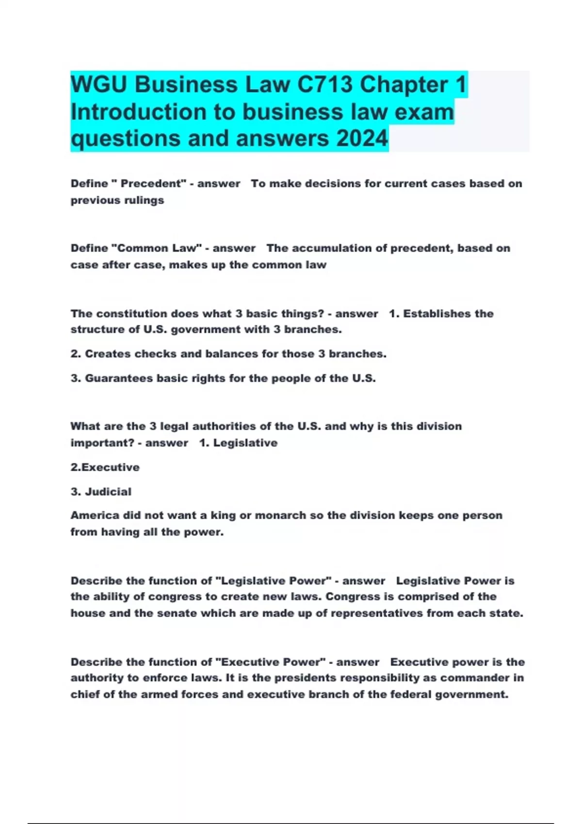 WGU Business Law C713 Chapter 1 Introduction to business law exam questions and answers 2024