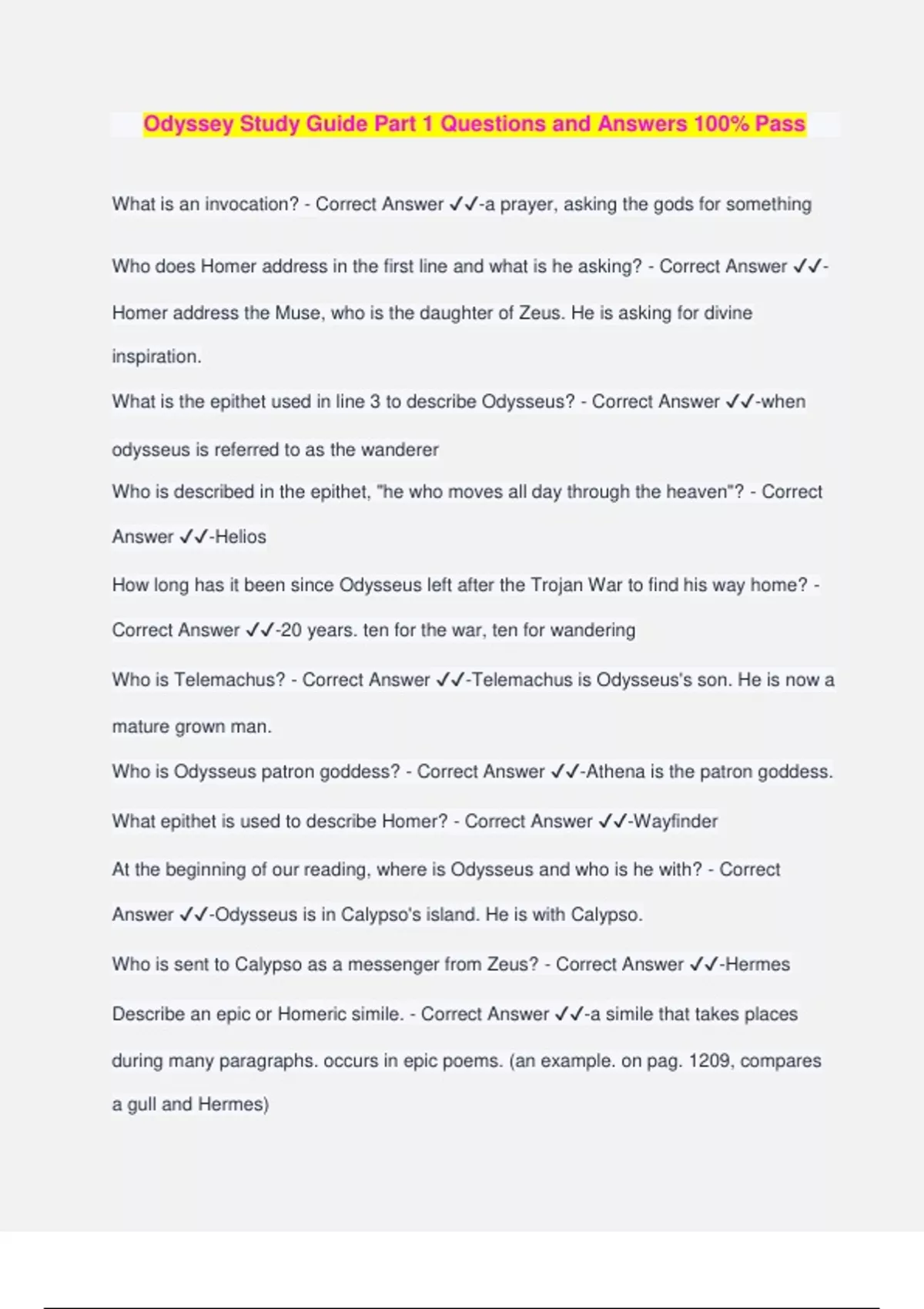 Odyssey Study Guide Part 1 Questions and Answers 100% Pass What is an invocation? - Correct Answer ️️ -a prayer, asking the gods for something Who does Homer address in the first line and what is he asking? - Correct Answer ️️ - Homer address the Muse, who is the daughter of Zeus. He is asking for divine inspiration. What is the epithet used in line 3 to describe Odysseus? - Correct Answer ️️ -when odysseus is referred to as the wanderer Who is described in the epithet, "he who moves all day through the heaven"? - Correct Answer ️️ -Helios How long has it been since Odysseus left after the Trojan War to find his way home? - Correct Answer ️️ -20 years. ten for the war, ten for wandering Who is Telemachus? - Correct Answer ️️ -Telemachus is Odysseus's son. He is now a mature grown man. Who is Odysseus patron goddess? - Correct Answer ️️ -Athena is the patron goddess. What epithet is used to describe Homer? - Correct Answer ️️ -Wayfinder At the beginning of our reading, where is Odysseus and who is he with? - Correct Answer ️️ -Odysseus is in Calypso's island. He is with Calypso. Who is sent to Calypso as a messenger from Zeus? - Correct Answer ️️ -Hermes Describe an epic or Homeric simile. - Correct Answer ️️ -a simile that takes places during many paragraphs. occurs in epic poems. (an example. on pag. 1209, compares a gull and Hermes) What is Odysseus doing when Homer introduces him to his readers? (line 40-43) - Correct Answer ️️ -Odysseus is crying. (irony: why would he want to leave the island, the goddess? he is supposed to be a tough Greek soilder) What does his emotional state reveal about his character? - Correct Answer ️️ -family friendly, lower, compassionate How does Calypso help to get Odysseus on his journey? - Correct Answer ️️ -advice and helps build a raft, food, drink To whom does Calypso compare herself to? - Correct Answer ️️ -compares herself to a mortal (Penelope) Whom does Odysseus chose? - Correc
