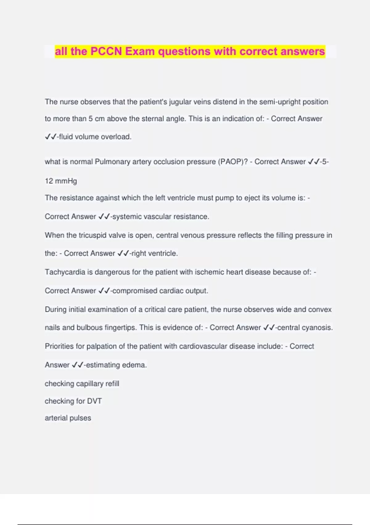 all the PCCN Exam questions with correct answers The nurse observes that the patient's jugular veins distend in the semi-upright position to more than 5 cm above the sternal angle. This is an indication of: - Correct Answer ️️ -fluid volume overload. what is normal Pulmonary artery occlusion pressure (PAOP)? - Correct Answer ️️ -5- 12 mmHg The resistance against which the left ventricle must pump to eject its volume is: - Correct Answer ️️ -systemic vascular resistance. When the tricuspid valve is open, central venous pressure reflects the filling pressure in the: - Correct Answer ️️ -right ventricle. Tachycardia is dangerous for the patient with ischemic heart disease because of: - Correct Answer ️️ -compromised cardiac output. During initial examination of a critical care patient, the nurse observes wide and convex nails and bulbous fingertips. This is evidence of: - Correct Answer ️️ -central cyanosis. Priorities for palpation of the patient with cardiovascular disease include: - Correct Answer ️️ -estimating edema. checking capillary refill checking for DVT arterial pulses By blocking the conversion of angiotensin I to angiotensin II, angiotensin-converting enzyme inhibitors produce: - Correct Answer ️️ -b. vasodilation. The nurse has read that the cardiologist recommends the use of class IV drugs to depress sinus and atrioventricular node conduction and terminate supraventricular tachycardias in the patient at this time. The nurse will anticipate orders for which medications? - Correct Answer ️️ -a. Verapamil, diltiazem, or amlodipine The nurse has administered a drug that stimulates β1-adrenergic sites. Following administration of the drug, the nurse will assess for: - Correct Answer ️️ -a. increased heart rate. The nurse is observing the patient's electrocardiographic monitor after insertion of a temporary pacemaker. Seeing a P-wave after the pacing artifact, the nurse knows that the: - Correct Answer ️️ -c. atrium is being paced. The possibility of microshock when handling a temporary pacemaker can be minimized by: - Correct Answer ️️ -b. insulating the ends of the wires. and wearing gloves when handling the pacing wires In the postoperative cardiovascular patient, the most frequent cause of a decreased cardiac output is: - Correct Answer ️️ -a. reduced preload. A patient is being monitored by continuous electrocardiogram (ECG) after placement of a transvenous pacemaker. "Loss of capture" is seen on the ECG. Which nursing intervention may correct this situation? - Correct Answer ️️ -a. Position the patient on the left side. or reposition the leads In analyzing the ECG strip, the nurse notices a spike before each QRS complex. The patient's heart rate is 70 beats/min. This phenomenon is reflective of - Correct Answer ️️ -b. pacing artifact; the pacemaker is sensing and capturing. Calculate the cerebral perfusion pressure (CPP) for a patient with a mean arterial pressure (MAP) = 95 mm Hg and an intracranial pressure (ICP) = 15 mm Hg. - Correct Answer ️️ -b. 80 mm Hg What procedure secures an arteriovenous malformation when a pt's condition is too unstable for surgery? - Correct Answer ️️ -embolization that can be done to secure the lesion without surgery. When the condition is more stable, an operation might be considered if needed. Knowing that a patient has hypoxemia and ischemia in his brain, the nurse anticipates which of the following? - Correct Answer ️️ -a. Cerebrovascular dilatio
