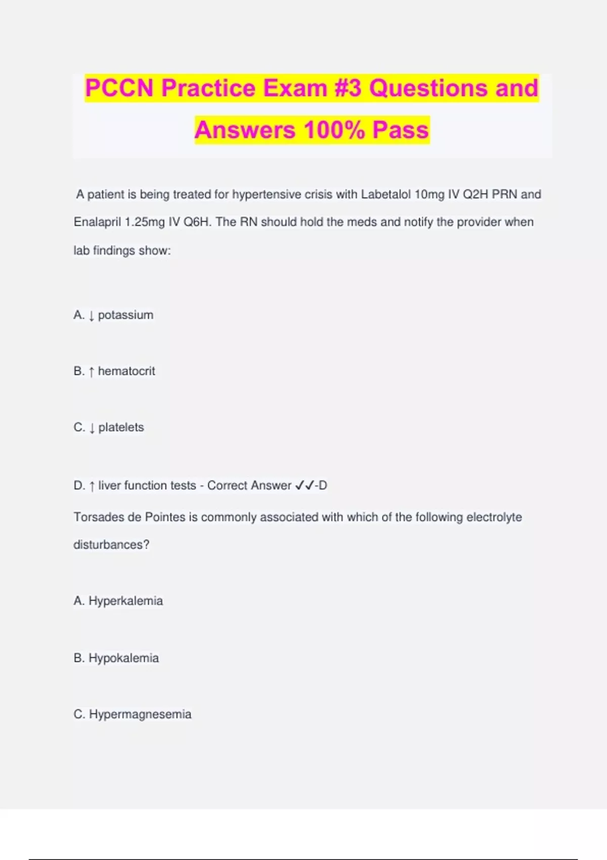PCCN Practice Exam #3 Questions and Answers 100% Pass A patient is being treated for hypertensive crisis with Labetalol 10mg IV Q2H PRN and Enalapril 1.25mg IV Q6H. The RN should hold the meds and notify the provider when lab findings show: A. ↓ potassium B. ↑ hematocrit C. ↓ platelets D. ↑ liver function tests - Correct Answer ️️ -D Torsades de Pointes is commonly associated with which of the following electrolyte disturbances? A. Hyperkalemia B. Hypokalemia C. Hypermagnesemia D. Hypomagnesemia - Correct Answer ️️ -D A patient is admitted to the hospital with abdmominal pain and nausea and was taken to the OR for an emergent bowel resection. The post-operative course has been complicated by septic shock and AKI. The patient is placed on intermittent HD. The nurse recognizes which of the following is a priority to ensure safe patient care while receiving renal replacement therapy? A. Invasive hemodynamic monitoring to assess fluid volume status hourly B. Frequent electrolyte monitoring to identify electrolyte shifts C. Hourly UO monitoring to know when HD should be d/c D. Daily weight monitoring to assess fluid status - Correct Answer ️️ -B A 52 year old male just underwent a 3 vessel CABG. He has been in NSR and suddenly converts to a-fib at a rate of 160. His BP suddenly drops to 72/46 (54) and is feeling SOB. You should anticipate which of the following? A. Adenosine 6mg rapid IVP B. Defibrillation with 100 J C. Synchronized cardioversion with 100 J D. Diltiazem bolus followed by an infusion - Correct Answer ️️ -C Which of the following is an example of advocacy? A. Standing behind organizational decisions that are formed based on the needs of patients B. Working with individuals to create synergistic relationships C. Consistently acting with intention and upholding ethical values and principles D. Being an honest and trustworthy individual - Correct Answer ️️ -A During a patient's admissions to the PCU, the RN notes a hgb level of 9g/dL and hct of 27ml/dL. Which med should be confirmed with the provider prior to administration? A. Metoprolol B. Sulfa-trimethoprim C. Erythropoietin D. Furosemide - Correct Answer ️️ -B (29) A 56 year old male presents in heart block with a ventricular rate of 38 caused from an intentional overdose from calcium channel blockers. What is the appropriate antidote? A. Glucagon B. Diphenhydramine C. Calcium D. Atropine - Correct Answer ️️ -C Acetylsalicylic acid (aspirin) is a non-steroidal anti-inflammatory medication that inhibits the release of which of the following? A. Platelets B. Fibrinogen C. Thromboxane A2 D. Nitric Oxide - Correct Answer ️️ -C The benefit of the Trans-jugular intrahepatic portosystemic shunt (TIPS) procedure is: A. Stop esophageal bleeding B. Relieve portal venous pressure C. Prevent liver enzyme elevation D. Increase blood flow to the liver - Correct Answer ️️ -B Which type of the following heart block complications would you monitor for in the setting of an anterior wall MI? A. 1st degree AV block B. 2nd degree Type I (Wenckebach) C. 2nd degree Type II D. Sinus bradycardia - Correct Answer ️️ -C Which of the following is a complication of infective endocarditis? A. Myocarditis B. Heart failure C. Emboli D. Pericarditis - Correct Answer ️️ -C The patient has been anuric for 2 days and is currently receiving intermittent dialysis with an order to perform ultrafiltration only. Because of this, you know the goal of the therapy is to: A. Remove cytokines B. Remove fluid only C. Rapid removal of excess electrolytes, such as potassium D. Remove metabolic waste such as urea nitrogen and creatinine - Correct Answer ️️ - B A 54 year old patient with no significant medical hx is admitted to the PCU 3 days following elective clipping of a cerebral aneurysm. Which of the followi