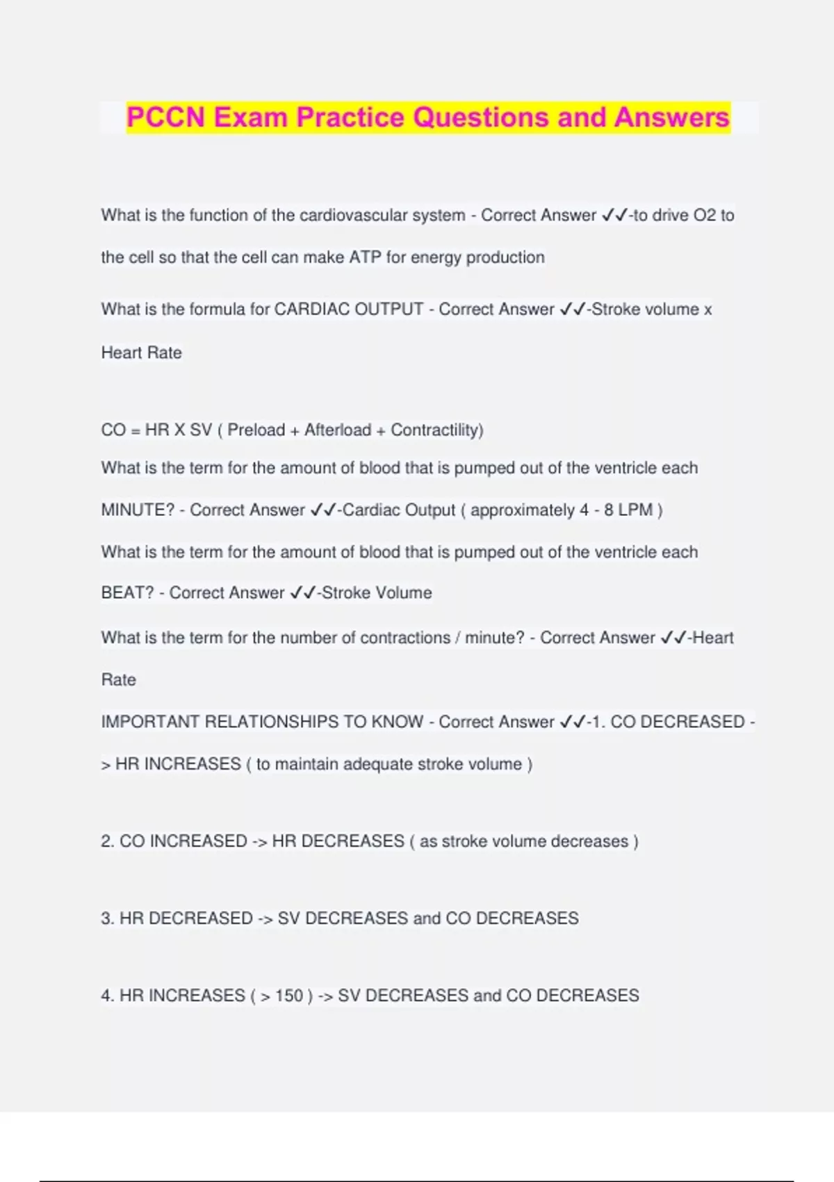 PCCN Exam Practice Questions and Answers What is the function of the cardiovascular system - Correct Answer ️️ -to drive O2 to the cell so that the cell can make ATP for energy production What is the formula for CARDIAC OUTPUT - Correct Answer ️️ -Stroke volume x Heart Rate CO = HR X SV ( Preload + Afterload + Contractility) What is the term for the amount of blood that is pumped out of the ventricle each MINUTE? - Correct Answer ️️ -Cardiac Output ( approximately 4 - 8 LPM ) What is the term for the amount of blood that is pumped out of the ventricle each BEAT? - Correct Answer ️️ -Stroke Volume What is the term for the number of contractions / minute? - Correct Answer ️️ -Heart Rate IMPORTANT RELATIONSHIPS TO KNOW - Correct Answer ️️ -1. CO DECREASED - > HR INCREASES ( to maintain adequate stroke volume ) 2. CO INCREASED -> HR DECREASES ( as stroke volume decreases ) 3. HR DECREASED -> SV DECREASES and CO DECREASES 4. HR INCREASES ( > 150 ) -> SV DECREASES and CO DECREASES 5. SV DECREASES -> CO DECREASES and HR INCREASES 6. SV INCREASES -> CO INCREASES and HR DECREASES What is the term for the volume of blood ejected from the ventricle per minute adjusted for body size - Correct Answer ️️ -Cardiac Index What is a normal cardiac index? - Correct Answer ️️ -Normal = 2.5 to 4.4 L/min/m2 **Always utilize CI values on exam (especially for bigger patients) What is a normal amount (mL/beat) for stroke volume? - Correct Answer ️️ -60 to 100 mL What is the term for the end-diastolic volume stretching the ventricle? - Correct Answer ️️ -Preload ( increased fluid = increased stroke volume ) What is the term for the pressure that the ventricle must OVERCOME in order to eject blood into the circulatory system? - Correct Answer ️️ -Afterload What is the term for the inotropic state the cardiac muscle - Correct Answer ️️ - Contractility (how well the heart is contracted) Preload is the function of which part of the circulatory system? - Correct Answer ️️ - VEINS FUNCTION OF VEINS = PRELOAD What is the RIGHT VENTRICLE PRELOAD assessed by? - Correct Answer ️️ -CVP (Central venous pressure) (Normal is approx. 2 - 8 mmhg) What is a normal central venous pressure ? - Correct Answer ️️ -Approximately 2 - 8 mmhg What is the LEFT VENTRICLE PRELOAD assessed by? - Correct Answer ️️ -PAOP (Pulmonary artery occlusion pressure) / PAW pulmonary artery wedg