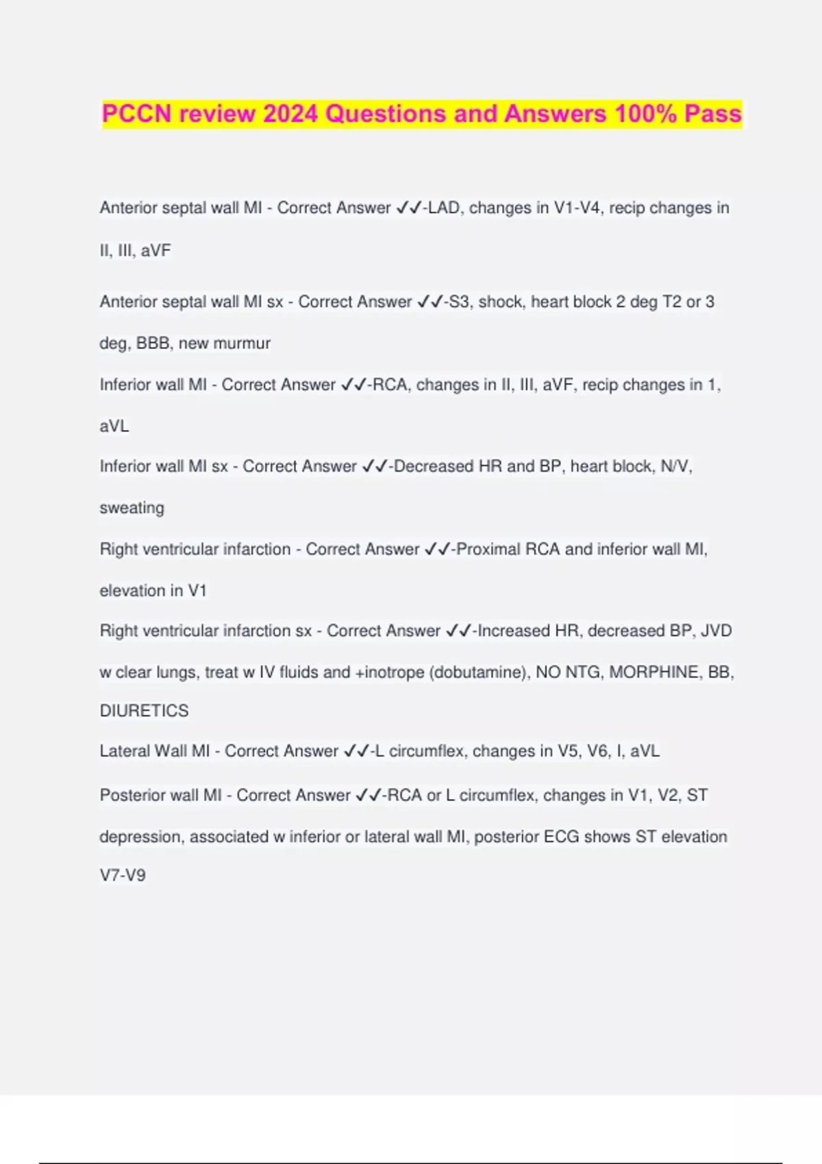 PCCN review 2024 Questions and Answers 100% Pass Anterior septal wall MI - Correct Answer ️️ -LAD, changes in V1-V4, recip changes in II, III, aVF Anterior septal wall MI sx - Correct Answer ️️ -S3, shock, heart block 2 deg T2 or 3 deg, BBB, new murmur Inferior wall MI - Correct Answer ️️ -RCA, changes in II, III, aVF, recip changes in 1, aVL Inferior wall MI sx - Correct Answer ️️ -Decreased HR and BP, heart block, N/V, sweating Right ventricular infarction - Correct Answer ️️ -Proximal RCA and inferior wall MI, elevation in V1 Right ventricular infarction sx - Correct Answer ️️ -Increased HR, decreased BP, JVD w clear lungs, treat w IV fluids and +inotrope (dobutamine), NO NTG, MORPHINE, BB, DIURETICS Lateral Wall MI - Correct Answer ️️ -L circumflex, changes in V5, V6, I, aVL Posterior wall MI - Correct Answer ️️ -RCA or L circumflex, changes in V1, V2, ST depression, associated w inferior or lateral wall MI, posterior ECG shows ST elevation V7-V9 Hyperkalemia cardiac sx - Correct Answer ️️ -Tented T wave ( >6.5), wide QRS, prolonged PR, wide P (>8.0), poor automaticity (10-11), p waves disappear to form sine wave Asystole, v-fib PE 12 lead - Correct Answer ️️ -R axis deviation, RBBB, st depression, t wave depression in V1-V4, tall peaked T wave in II, III, aVF S1 - Correct Answer ️️ -mitral and tricuspid close, systole S2 - Correct Answer ️️ -Pulmonic and aortic close, diastole Aortic stenosis - Correct Answer ️️ -Systolic, LV hypertrophic w increased resistance Sx- HF, SOB, chronic increased afterload Tx- TAVR (risk stroke, bradycardia, heart block, pacemaker) Aortic regurgitation - Correct Answer ️️ -diastolic murmur, backflow blood, L vent hypertrophy Causes- HTN, RHD, endocarditis, Marfan syndrome Sx- demusset sign, brisk carotid upstroke, wide pulse pressure, water hammer ECG mitral stenosis - Correct Answer ️️ -diastolic murmur Sx- pink cheeks, pulm edema, a fib, increased R heart pressures, pulm HTN Tx- decreased preload and afterload, valve repair, balloon valvuloplasty mitral regurgitation - Correct Answer ️️ -systolic murmur Causes- MI, L HF, ruptured chordae tendineae, L vent hypertrophy, cardiomyopathy, mitral valve prolapse, RHD, endocarditis Sx- orthopnea, fatigue, angina, increased L atria pressure, R&L HF, afib Tx- meds to decrease preload and afterload, mitraclip, valve replacement Systolic murmur - Correct Answer ️️ -Pulmonic and aortic stenosis Tricuspid and mitral regurgitation S1- murmur- S2 Diastolic murmur - Correct Answer ️️ -Tricuspid and mitral stenosis Pulmonic and aortic regurgitation S1- S2- murmur Dobutamine (Dobutrex) - Correct Answer ️️ -+ Inotrope, i