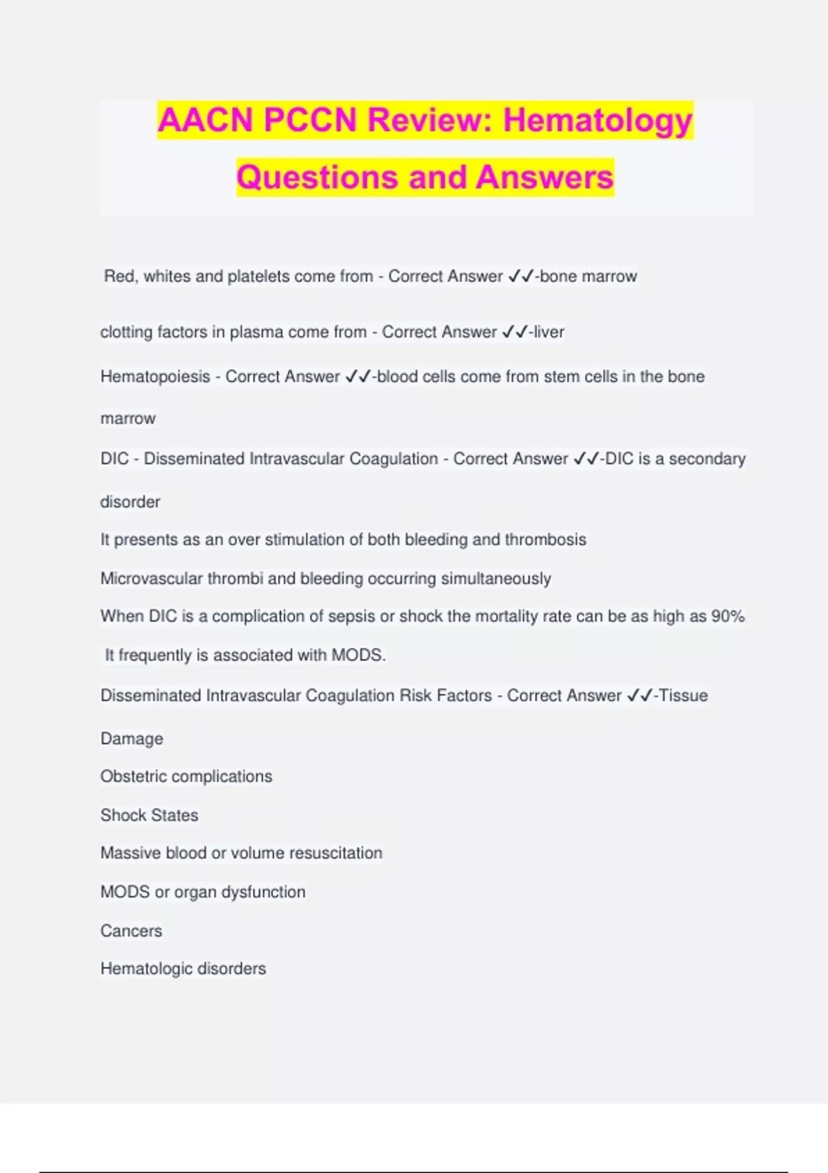 AACN PCCN Review: Hematology Questions and Answers Red, whites and platelets come from - Correct Answer ️️ -bone marrow clotting factors in plasma come from - Correct Answer ️️ -liver Hematopoiesis - Correct Answer ️️ -blood cells come from stem cells in the bone marrow DIC - Disseminated Intravascular Coagulation - Correct Answer ️️ -DIC is a secondary disorder It presents as an over stimulation of both bleeding and thrombosis Microvascular thrombi and bleeding occurring simultaneously When DIC is a complication of sepsis or shock the mortality rate can be as high as 90% It frequently is associated with MODS. Disseminated Intravascular Coagulation Risk Factors - Correct Answer ️️ -Tissue Damage Obstetric complications Shock States Massive blood or volume resuscitation MODS or organ dysfunction Cancers Hematologic disorders DCI Response - Correct Answer ️️ -Tissue Damage Platelet damage Endothelial damage when these line up, DIC will begin as a clotting process DIC Process - Correct Answer ️️ -Tissue Damage --> stimulates clotting --> platelets aggregate to form clot --> stimulate the mediators to break up clot This is a normal process but in DIC this process becomes chaotic Clot --> from clot you produce mediators to break down clot --> start bleeding again --> more clots forms and more clots broken down --> patient begins to lose ability to form clots Consumptive Coagulopathy --- you have used up your abil