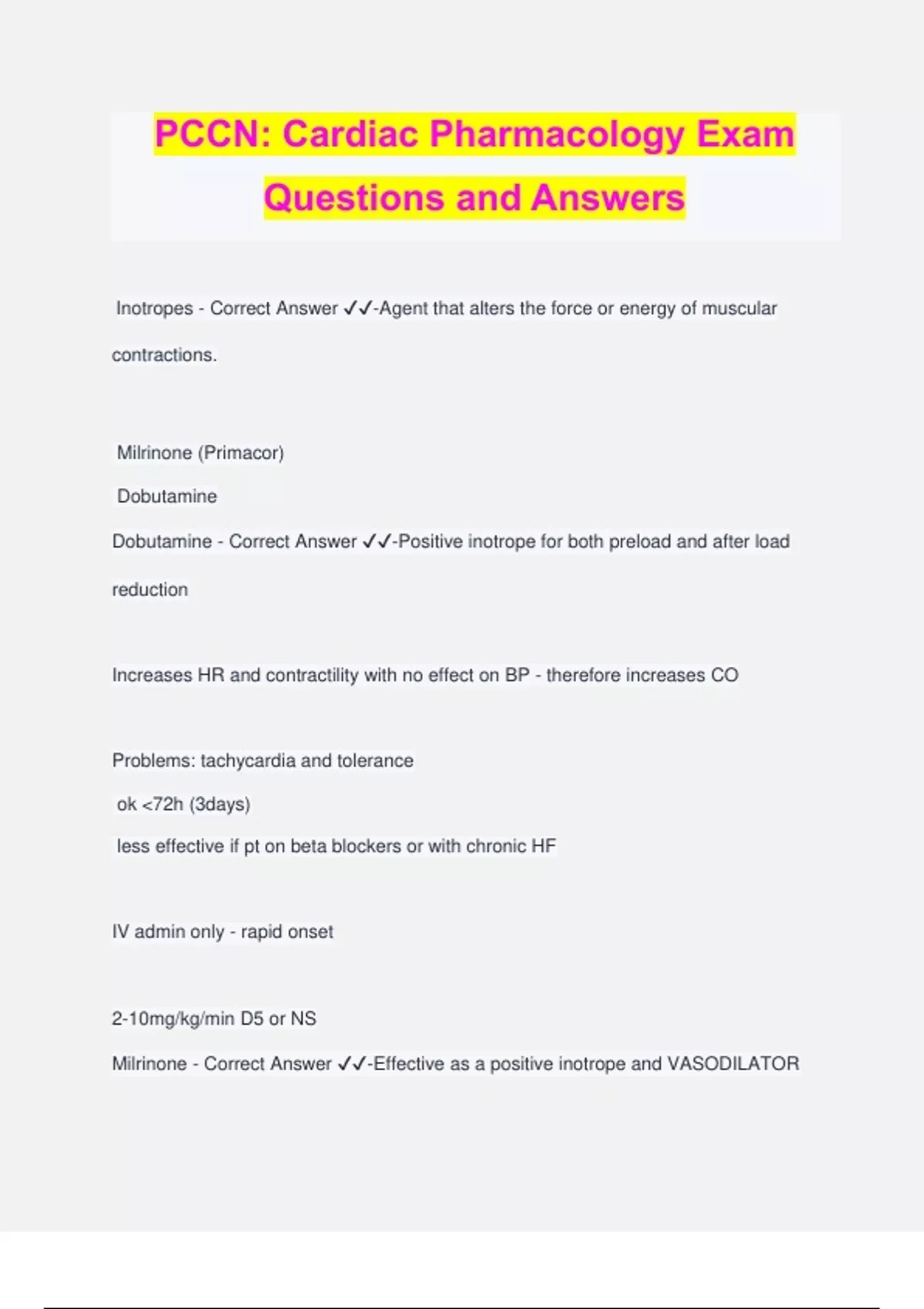PCCN: Cardiac Pharmacology Exam Questions and Answers