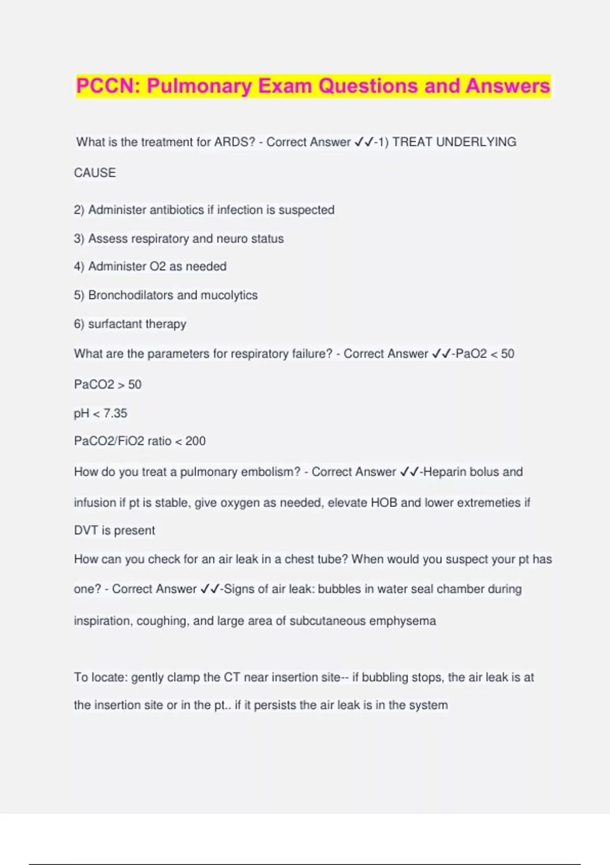 PCCN: Pulmonary Exam Questions and Answers What is the treatment for ARDS? - Correct Answer ️️ -1) TREAT UNDERLYING CAUSE 2) Administer antibiotics if infection is suspected 3) Assess respiratory and neuro status 4) Administer O2 as needed 5) Bronchodilators and mucolytics 6) surfactant therapy What are the parameters for respiratory failure? - Correct Answer ️️ -PaO2 < 50 PaCO2 > 50 pH < 7.35 PaCO2/FiO2 ratio < 200 How do you treat a pulmonary embolism? - Correct Answer ️️ -Heparin bolus and infusion if pt is stable, give oxygen as needed, elevate HOB and lower extremeties if DVT is present How can you check for an air leak in a chest tube? When would you suspect your pt has one? - Correct Answer ️️ -Signs of air leak: bubbles in water seal chamber during inspiration, coughing, and large area of subcutaneous emphysema