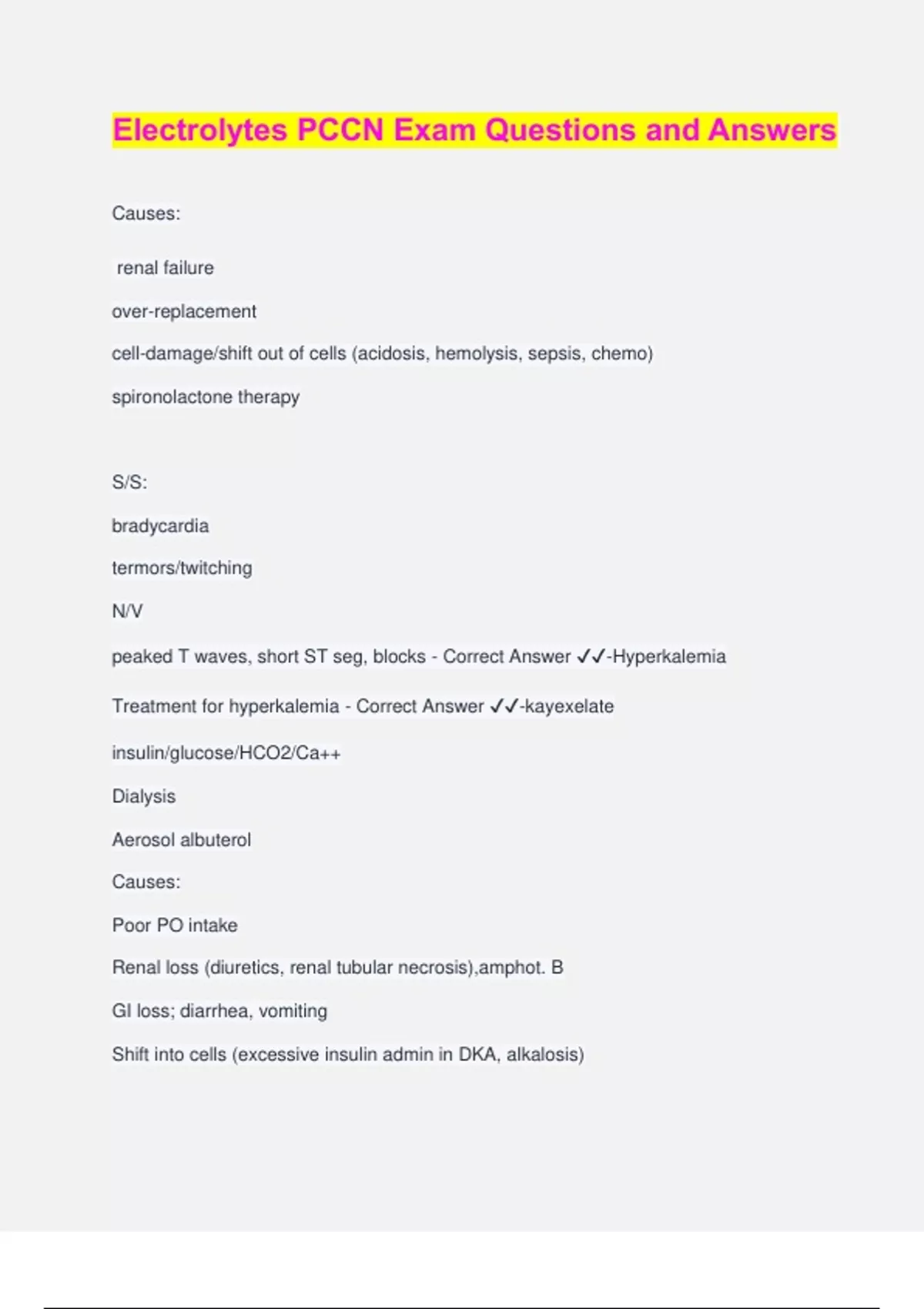 Electrolytes PCCN Exam Questions and Answers