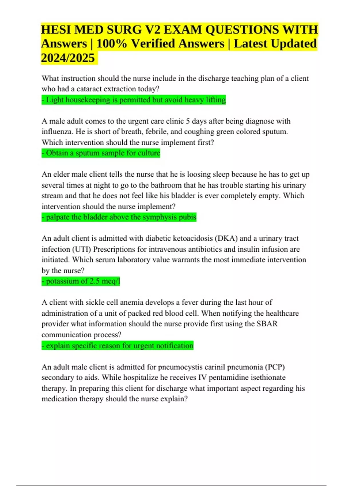 HESI MED SURG V2 EXAM QUESTIONS WITH Answers | 100% Verified Answers | Latest Updated 2024/2025. What instruction should the nurse include in the discharge teaching plan of a client who had a cataract extraction today? - Light housekeeping is permitted but avoid heavy lifting A male adult comes to the urgent care clinic 5 days after being diagnose with influenza. He is short of breath, febrile, and coughing green colored sputum. Which intervention should the nurse implement first? - Obtain a sputum sample for culture An elder male client tells the nurse that he is loosing sleep because he has to get up several times at night to go to the bathroom that he has trouble starting his urinary stream and that he does not feel like his bladder is ever completely empty. Which intervention should the nurse implement? - palpate the bladder above the symphysis pubis An adult client is admitted with diabetic ketoacidosis (DKA) and a urinary tract infection (UTI) Prescriptions for intravenous antibiotics and insulin infusion are initiated. Which serum laboratory value warrants the most immediate intervention by the nurse? - potassium of 2.5 meq/l A client with sickle cell anemia develops a fever during the last hour of administration of a unit of packed red blood cell. When notifying the healthcare provider what information should the nurse provide first using the SBAR communication process? - explain specific reason for urgent notification An adult male client is admitted for pneumocystis carinil pneumonia (PCP) secondary to aids. While hospitalize he receives IV pentamidine isethionate therapy. In preparing this client for discharge what important aspect regarding his medication therapy should the nurse explain? HESI MED SURG V2 EXAM QUESTIONS WITH Answers | 100% Verified Answers | Latest Updated 2024/2025 - It will be necessary to continue prophylactic doses of IV or aerosol pentamine every month A client subjective data includes dysuria, urgency, and urinary frequency. What action should the nurse implement next? - collect a clean catch specimen A client tells the nurse that her biopsy results indicate that the cancer cells are well differentiated How should the nurse respond? - ask the client in the healthcare provider has giving her any information about the classification of her cancer A client with a chronic kidney disease is treated on hemodialysis. During the 1 treatment clients blood pressure drops from 150/90 to 80/30 Which action should the nurse take first? - stop dialysis treatment A client with deep vain thrombosis (DVT) is receiving a continues infusion of heparin sodium 25,000 unit in 5% dextrose injection 250ml. The prescription indicates the dosage should be increase 900 units/hr. The nurse should program the infusion pump to deliver how many ml/hr? - 9 The nurse is obtaining the admission history for a client with suspected peptic ulcer disease (PUD). Which subjective data reported by the client supports this diagnosis? - upper mid abdominal gnawing and burning pain The nurse is providing preoperative education for a jewish client schedule to receive a xenograft graft to promote burn healing. Which information should the nurse provide this client? - the xenograft is taken from nonhuman sources A client who took a camping vacation two weeks ago in a country with a tropical climate comes to the clinic describing vague symptoms and diarrhea for the past week. Which finding is most important for the nurse to report? - jaundice sclera During a home visit the nurse assesses the skin of a client with eczema who reports than an exacerbation of symptoms has occurred during the last week. Which information is most useful in determining the possible cause of the symptoms? - a grandson and his new dog recently visited When explaining dietary guidelines to a client with acute glomerulonephritis (AGN) which instruction should the nurse include in the dietary teaching - restrict sodium intake A male client who is 24hr post operative for an exploratory laparoctomy complains that he is starving because he has had no real food since before surgery. Prior to advancing his diet which intervention should the nurse implememt? - Auscultate bowel sound in all four quadrants A client diagnose with stable angina secondary to ischemic heart disease has a prescription for sublingual (SL) nitroglycerin (NTG). The nurse should tell the client to follow which instructions if chest pain is not relieved after taking 3 NTG tables 5 min apart - call 911 pain is unrelieved and chew a tablet of aspirin 325mg After taking orlistat (Xenical) for one week a femela client tells the home health nurse that she is experiencing increasingly frequent oily stools and flatus. What action should the nurse take? - ask the client to describe her dietary intake history for the last several days Two days after an abscess of the chin was drained the client returns to the clinic with fever chills and a maculopapular rash with pruritis. The client has taken an oral antibiotic and cleansed the wound today with provide iodine (Betadine) solution. Which intervention should the nurse implement first? - assess airway patency and oxygen saturation A client experiences an ABO incompatibility reaction after multiple blood transfusions. Which finding should the nurse report immediately to the health care provider? - low back pain and hypotension 1.A young adult male who has had type 2 diabetes mellitus (DM) is admitted to the intensive care unit with hyperglycemic nonketotic syndrome (HHNS). A sliding scale protocol for an isotonic IV solution with regular insulin is prescribed based on the results of a continuous blood glucose monitoring device that is attached to the client's central venous catheter. When the client's respirations become labored and his lungs sound indicate crackles what action should the nurse take? - decrease infusion rate to address fluid overload When preparing to apply a fentanyl (Duragesic) transdermal patch the nurse n