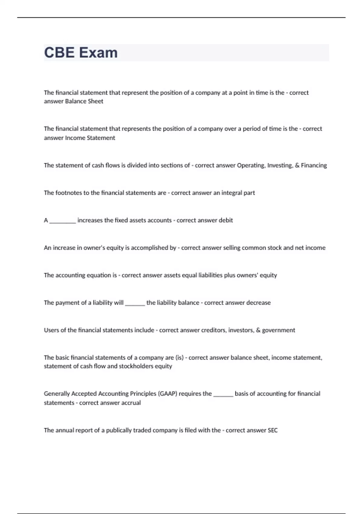 CBE ExamThe financial statement that represent the position of a company at a point in time is the - correct answer Balance Sheet The financial statement that represents the position of a company over a period of time is the - correct answer Income Statement The statement of cash flows is divided into sections of - correct answer Operating, Investing, & Financing The footnotes to the financial statements are - correct answer an integral part A ________ increases the fixed assets accounts - correct answer debit An increase in owner's equity is accomplished by - correct answer selling common stock and net income The accounting equation is - correct answer assets equal liabilities plus owners' equity The payment of a liability will ______ the liability balance - correct answer decrease Users of the financial statements include - correct answer creditors, investors, & government The basic financial statements of a company are (is) - correct answer balance sheet, income statement, statement of cash flow and stockholders equity Generally Accepted Accounting Principles (GAAP) requires the ______ basis of accounting for financial statements - correct answer accrual The annual report of a publically traded company is filed with the - correct answer SEC