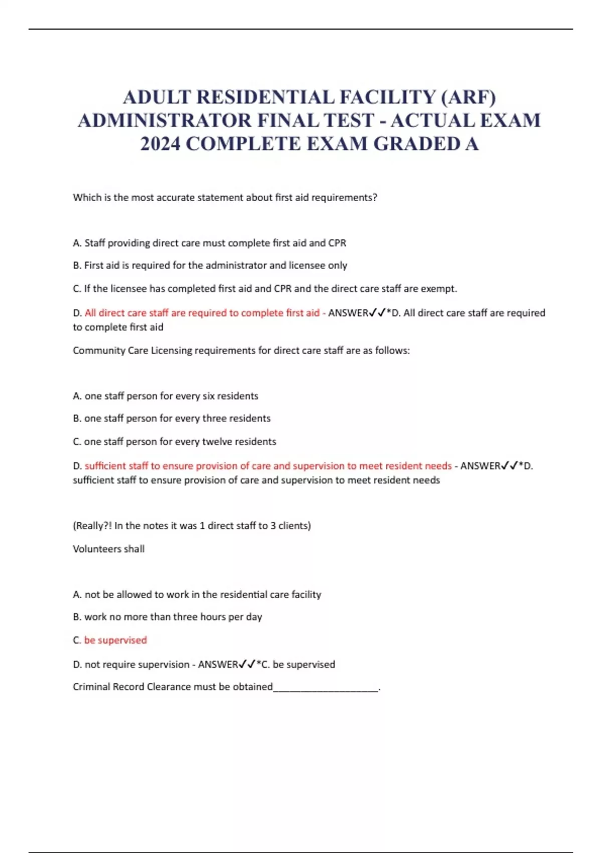 ADULT RESIDENTIAL FACILITY (ARF) ADMINISTRATOR FINAL TEST - ACTUAL EXAM 2024 COMPLETE EXAM GRADED A