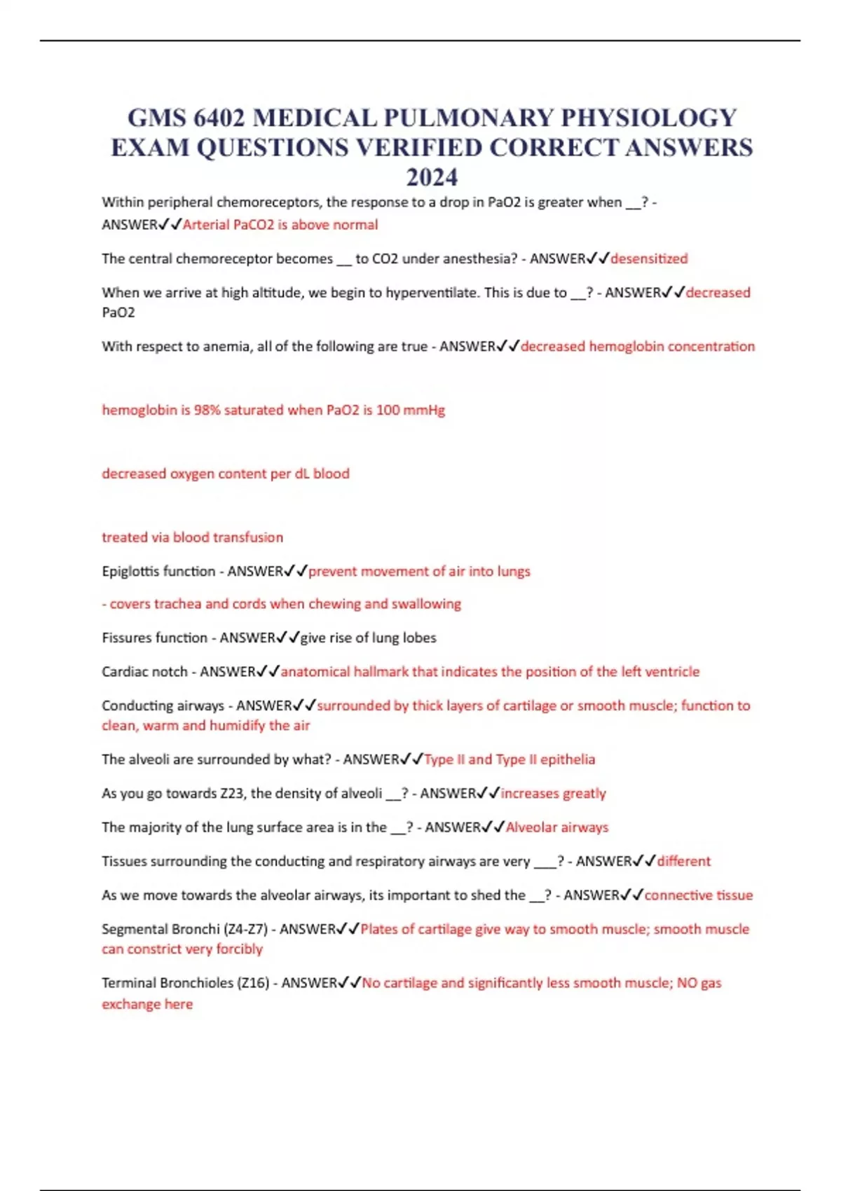 GMS 6402 MEDICAL PULMONARY PHYSIOLOGY EXAM QUESTIONS VERIFIED CORRECT ANSWERS 2024