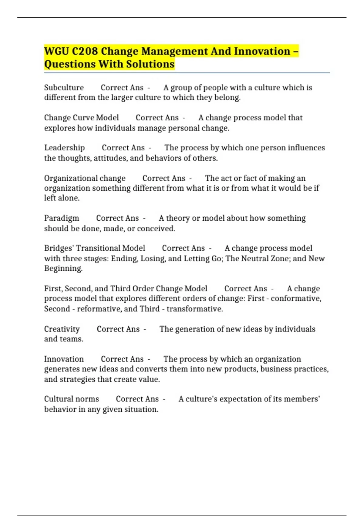WGU C208 Change Management And Innovation – Questions With Solutions