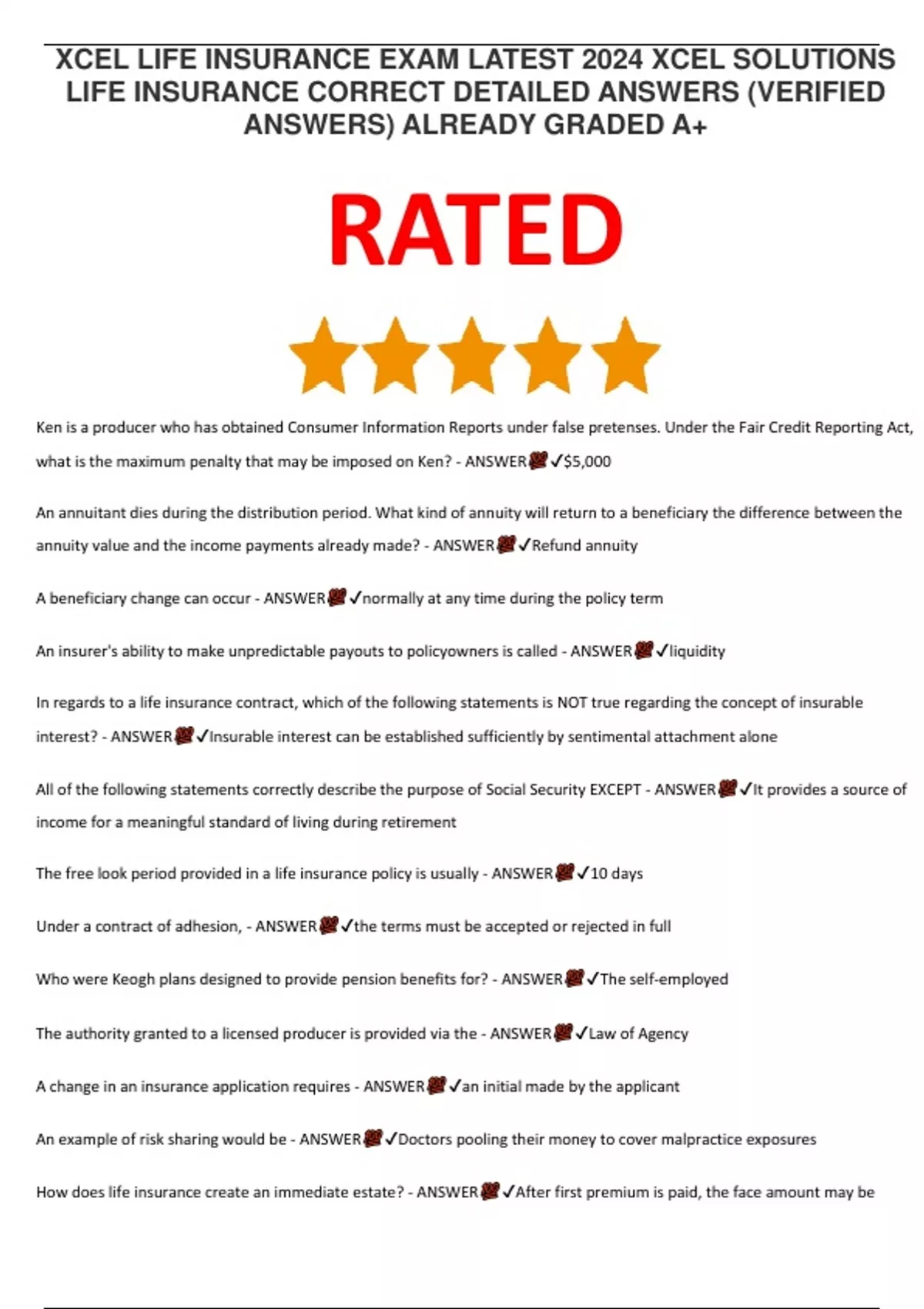 XCEL LIFE INSURANCE EXAM LATEST 2024 XCEL SOLUTIONS LIFE INSURANCE CORRECT DETAILED ANSWERS (VERIFIED ANSWERS) ALREADY GRADED A+