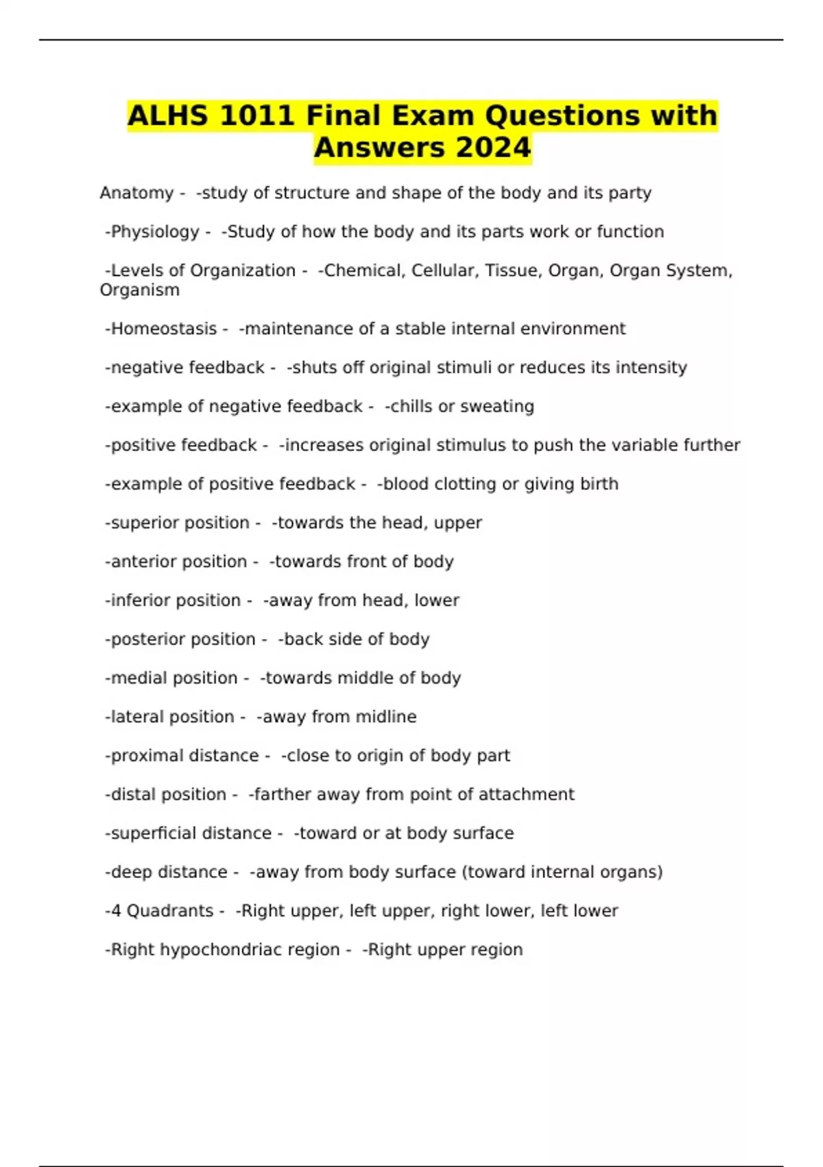ALHS 1011 Final Exam Questions with Answers 2024