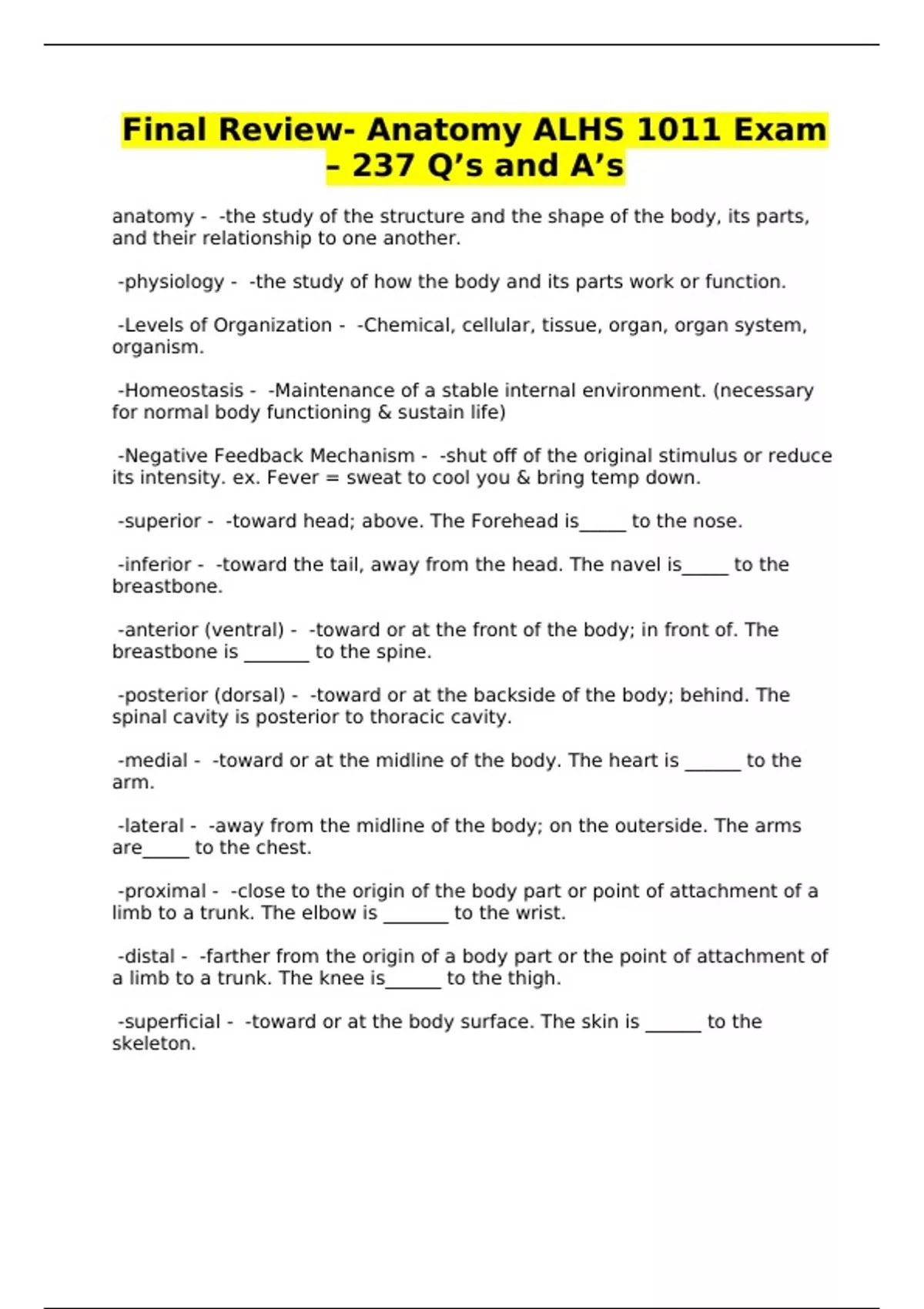 Final Review- Anatomy ALHS 1011 Exam – 237 Q’s and A’s