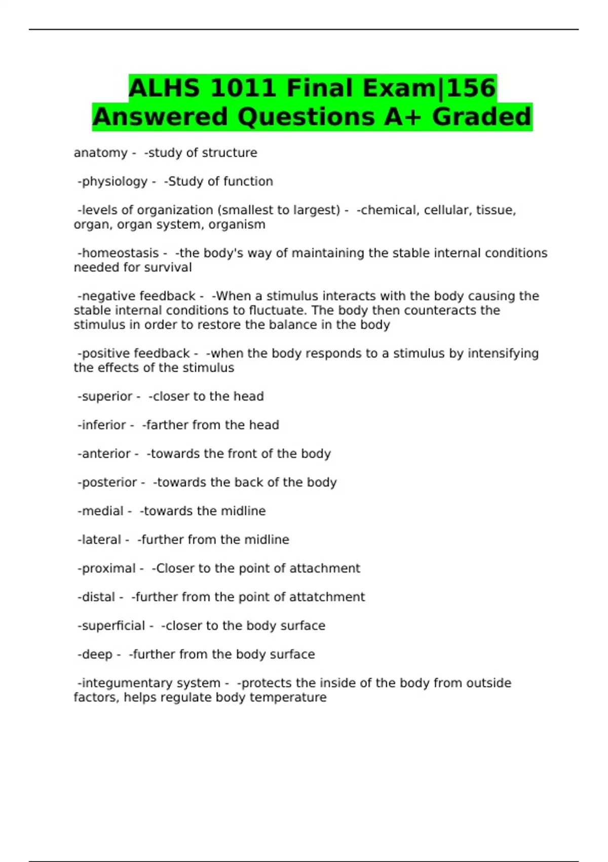 ALHS 1011 Final Exam|156 Answered Questions A+ Graded