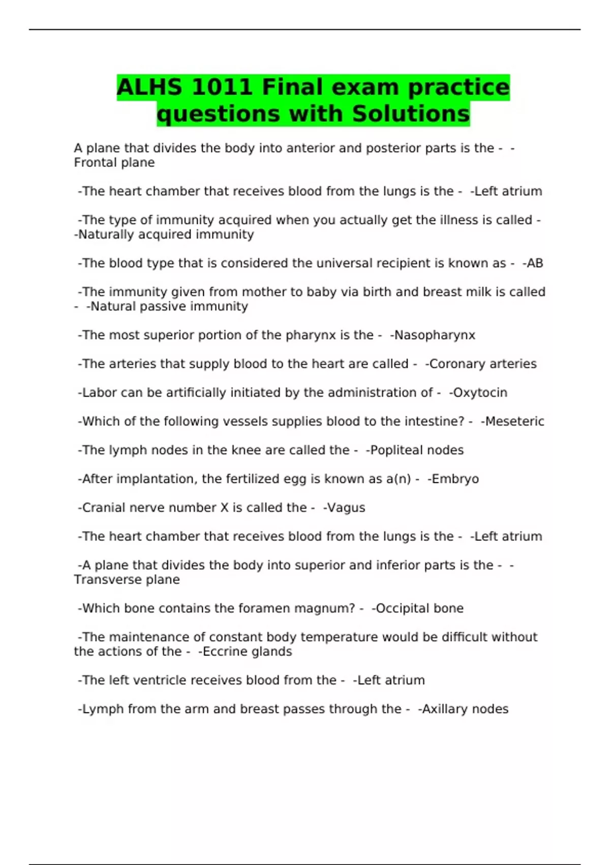 ALHS 1011 Final exam practice questions with Solutions