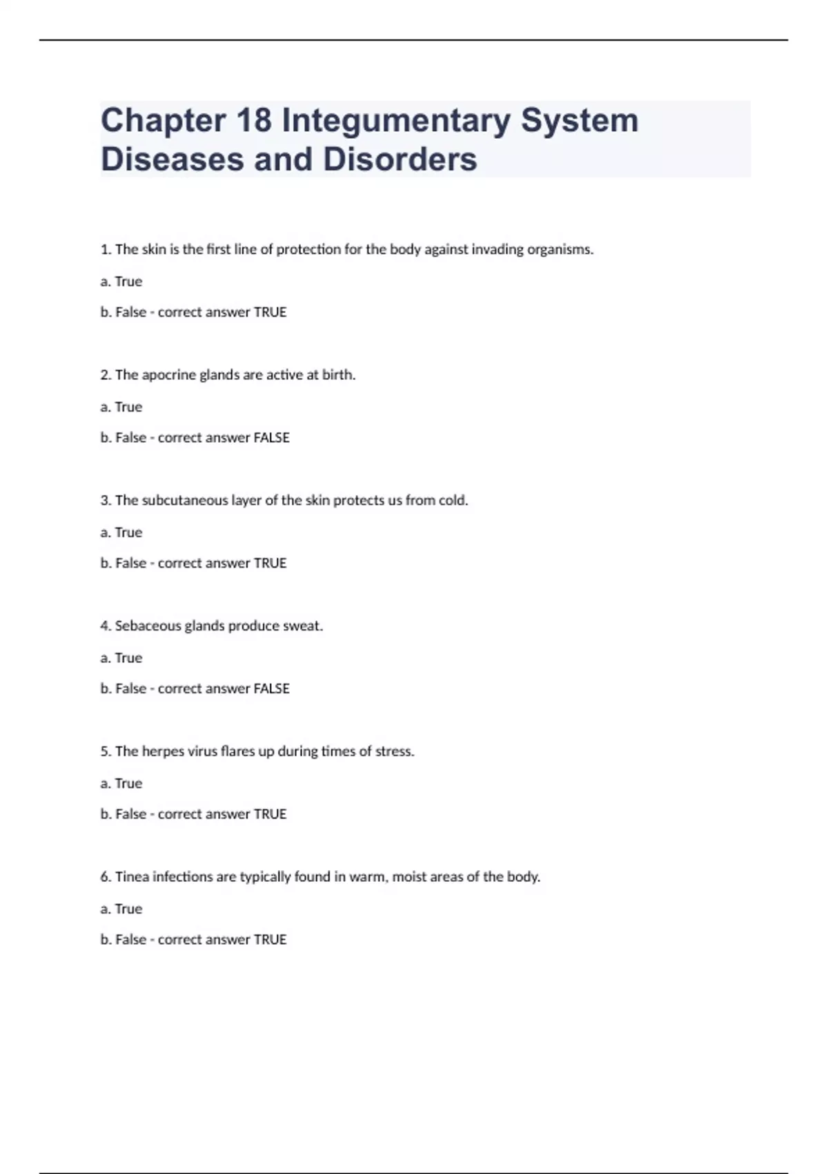 Chapter 18 Integumentary System Diseases and Disorders Review Exam Questions 2024. 1. The skin is the first line of protection for the body against invading organisms. a. True b. False - correct answer TRUE 2. The apocrine glands are active at birth. a. True b. False - correct answer FALSE 3. The subcutaneous layer of the skin protects us from cold. a. True b. False - correct answer TRUE 4. Sebaceous glands produce sweat. a. True b. False - correct answer FALSE 5. The herpes virus flares up during times of stress. a. True b. False - correct answer TRUE 6. Tinea infections are typically found in warm, moist areas of the body. a. True b. False - correct answer TRUE 7. Fungal infections are easily treated with antifungal medications such as miconazole. a. True b. False - correct answer FALSE 8. Body lice were responsible for the spread of typhus during war times. a. True b. False - correct answer TRUE 9. Scabies are spread by the oral-fecal route. a. True b. False - correct answer FALSE