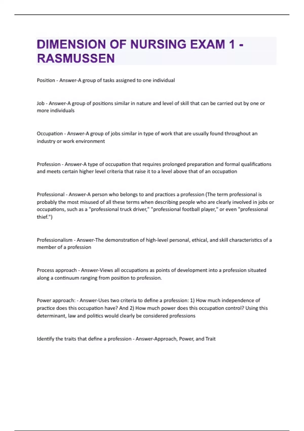 RASMUSSEN Position - Answer -A group of tasks assigned to one individual Job - Answer -A group of positions similar in nature and level of skill that can be carried out by one or more individuals Occupation - Answer -A group of jobs similar in type of work that are usually found throughout an industry or work environment Profession - Answer -A type of occupation that requires prolonged preparation and formal qualifications and meets certain higher level criteria that raise it to a level above that of an occupation Professional - Answer -A person who belongs to and practices a profession (The term professional is probably the most misused of all these terms when describing people who are clearly involved in jobs or occupations, such as a "professional truck driver," " professional football player," or even "professional thief.") Professionalism - Answer -The demonstration of high -level personal, ethical, and skill characteristics of a member of a profession Process approach - Answer -Views all occupations as points of development into a profession situated along a continuum ranging from position to profession. Power approach: - Answer -Uses two criteria to define a profession: 1) How much independence of practice does this occupation have? And 2) How much power does this occupation control? Using this determinant, law and politics would clearly be considered prof essions Identify the traits that define a profession - Answer -Approach, Power, and Trait Trait approach - Answer -3 theorists (Abraham Flexner, Elizabeth Bixler, and Eliza Pabalko). They determined these characteristics to be important: ▪ High intellectual level ▪ High level of individual responsibility and accountability ▪ The specialized body of knowledge ▪ The knowledge that can be learned in institutions of higher education ▪ Public service and altruistic activities ▪ Public service valued over financial gain ▪ The relatively high degree of autonomy and independence of practice ▪ Need for a well -organized and strong organization representing the members of the profession and controlling the quality of practice ▪ A code of ethics that guides members of the profession in their practice ▪ Strong professional identity and commitment to the development of the profession ▪ Demonstration of professional competency and possession of a legally recognized license High Intellectual Level: - Answer -as health care has advanced and made great strides in technology, pharmacology, and all branches of the physical sciences, a high level of intellectual functioning is required for even relatively simple nursing tasks, such as taking a client's temperature or blood pressure using automated equipment. High Level of Individual Responsibility and Accountability: - Answer -Nurses are often the primary, and frequently the only, defendants named when errors are made that result in injury to the client. Nurses must be accountable and demonstrate a high level o f individual responsibility for the care and services they provide Review how nursing compares with other professions - Answer -o High Intellectual Level o High Level of Individual Responsibility and Accountability o Specialized Body of Knowledge: o Evidence -Based Practice: o Public Service and Altruistic Activities: