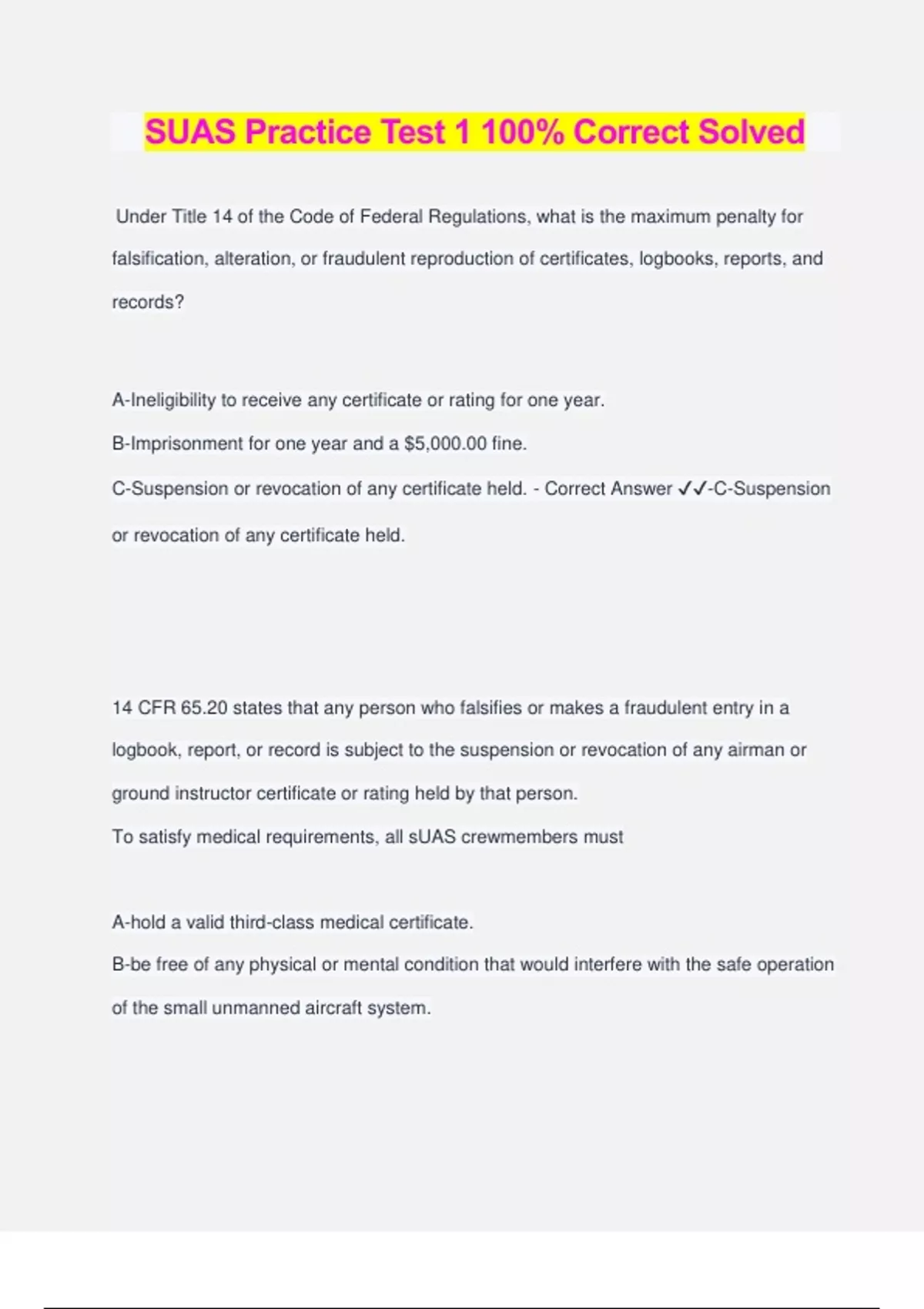 SUAS Practice Test 1 100% Correct Solved Under Title 14 of the Code of Federal Regulations, what is the maximum penalty for falsification, alteration, or fraudulent reproduction of certificates, logbooks, reports, and records? A-Ineligibility to receive any certificate or rating for one year. B-Imprisonment for one year and a $5,000.00 fine. C-Suspension or revocation of any certificate held. - Correct Answer ️️ -C-Suspension or revocation of any certificate held. 14 CFR 65.20 states that any person who falsifies or makes a fraudulent entry in a logbook, report, or record is subject to the suspension or revocation of any airman or ground instructor certificate or rating held by that person. To satisfy medical requirements, all sUAS crewmembers must A-hold a valid third-class medical certificate. B-be free of any physical or mental condition that would interfere with the safe operation of the small unmanned aircraft system. C-complete a physical with an Aviation Medical Examiner. - Correct Answer ️️ -B-be free of any physical or mental condition that would interfere with the safe operation of the small unmanned aircraft system. No person may manipulate the flight controls of a small unmanned aircraft system or act as a remote pilot-in-command, visual observer, or direct participant in the operation of the small unmanned aircraft if he or she knows or has reason to know that he or she has a physical or mental condition that would interfere with the safe operation of the small unmanned aircraft system. If requested, to whom must I present my Remote Pilot Certificate? A-A person of authority. B-FAA Inspector. C-Authorized representative of the Department of State. - Correct Answer ️️ -B-FAA Inspector. A remote pilot-in-command, owner, or person manipulating the flight controls of a small unmanned aircraft system must, upon request, make available to the Administrator: (1) the remote pilot certificate with a small UAS rating; and (2) any other document, record, or report required. Whose sole task during an sUAS operation is to watch the sUAS and report potential hazards to the rest of the crew? A-Remote Pilot in Command. B-Remote Pilot in Command. C-Visual Observer. - Correct Answer ️️ -C-Visual Observer. The visual observer (when asked by the remote PIC) maintains visual line of sight with the sUAS and reports any potential hazards to the remote PIC and person manipulating the controls. A professional wildlife photographer operates an sUAS from a moving truck to capture aerial images of migrating birds in remote wetlands. The driver of the truck does not serve any crewmember role in the operation. Is this sUAS operation in compliance with 14 CFR Part 107? A-Compliant with Part 107. B-Not compliant with Part 107. C-Not compliant with state and local traffic laws. - Correct Answer ️️ -A-Compliant with Part 107. You may operate an sUAS from a moving vehicle if you are in a sparsely populated area and the driver does not serve as the remote PIC, person manipulating the controls, or visual observer. While operating a small unmanned aircraft system (sUAS), you experience a flyaway and several people suffer injuries. Which of the following injuries requires reporting to the FAA? A-An injury requiring an overnight hospital stay. B-Scrapes and cuts bandaged on site. C-Minor bruises. - Correct Answer ️️ -A-An injury re