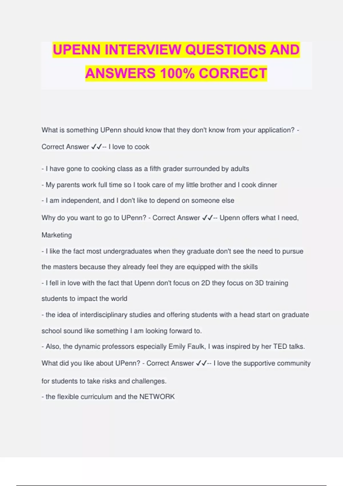 UPENN INTERVIEW QUESTIONS AND ANSWERS 100% CORRECT What is something UPenn should know that they don't know from your application? - Correct Answer ️️ -- I love to cook - I have gone to cooking class as a fifth grader surrounded by adults - My parents work full time so I took care of my little brother and I cook dinner - I am independent, and I don't like to depend on someone else Why do you want to go to UPenn? - Correct Answer ️️ -- Upenn offers what I need, Marketing - I like the fact most undergraduates when they graduate don't see the need to pursue the masters because they already feel they are equipped with the skills - I fell in love with the fact that Upenn don't focus on 2D they focus on 3D training students to impact the world - the idea of interdisciplinary studies and offering students with a head start on graduate school sound like something I am looking forward to. - Also, the dynamic professors especially Emily Faulk, I was inspired by her TED talks. What did you like about UPenn? - Correct Answer ️️ -- I love the supportive community for students to take risks and challenges. - the flexible curriculum and the NETWORK