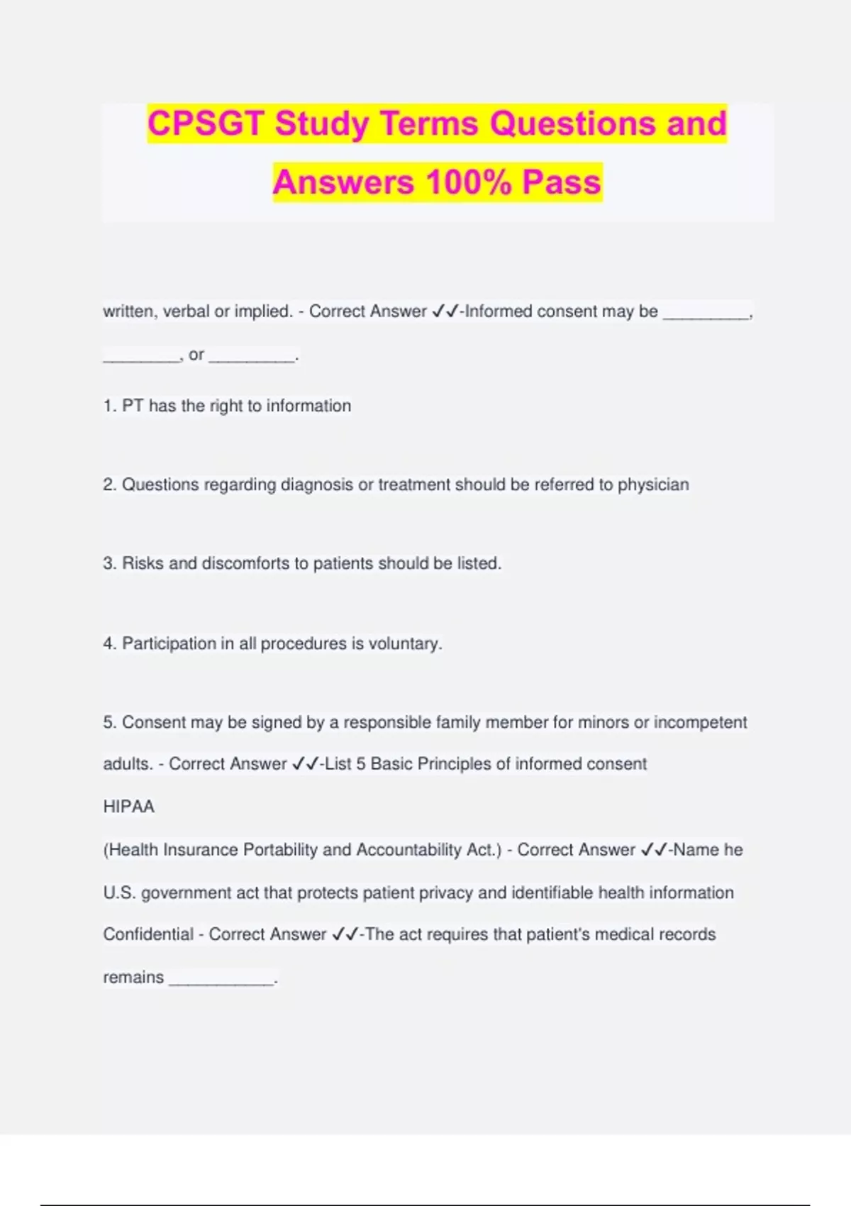 CPSGT Study Terms Questions and Answers 100% Pass written, verbal or implied. - Correct Answer ️️ -Informed consent may be _________, ________, or _________. 1. PT has the right to information 2. Questions regarding diagnosis or treatment should be referred to physician 3. Risks and discomforts to patients should be listed. 4. Participation in all procedures is voluntary. 5. Consent may be signed by a responsible family member for minors or incompetent adults. - Correct Answer ️️ -List 5 Basic Principles of informed consent HIPAA (Health Insurance Portability and Accountability Act.) - Correct Answer ️️ -Name he U.S. government act that protects patient privacy and identifiable health information Confidential - Correct Answer ️️ -The act requires that patient's medical records remains ___________. Only those who need to know the information for procedures/diagnoses, including polysomnography procedures and reports - Correct Answer ️️ -Who is permitted to access PT medical records? 1. Privacy 2. Advanced Directives (DNR, Power of Attorney, Living will) 3. Access to information 4. Autonomy- right to refuse medical treatment including a PSG - Correct Answer ️️ - List the 4 additional rights in the Patient's Bill of Rights that must be provided when caring for a patient. 1. Competence- Know/adhere to pro standard 2. Compliance- with procedures and policies. 3. Charting- Completely, consistently 4. Communication- 5. Confidentiality- 6. Courtesy- Attitude and rapport 7.Carefulness- - Correct Answer ️️ -Describe the "7 C's" of Malpractice Prevention "Let the master answer" Employers are held liable for their employee - Correct Answer ️️ -Explain what "Respondeat Superior" means "The thing speaks for itself" Requires the defendant to prove their innocence. - Correct Answer ️️ -Explain what "Res ipsa loquiter" means 1. Standards for RPSGT 2. Serve as a guide wherein RPSGT may evaluate conduct as it pertains to patients, health care consumers, and members of health care teams. 3. Define the use of RPSGT credential - Correct Answer ️️ -Describe he purpose of the BRPT Code of Ethics www.BRPT.org - Correct Answer ️️ -Where can you find the complete BRPT Code of Ethics? Protect public from misrepresentation of non credentialed practitioners. - Correct Answer ️️ -Describe the purpose of the National Board for Respiratory Care. (NBRC) Judicial and Ethics policy 1. Falsified credentials 2. Altered examination scores 3. Forged educational documents 4. Unacceptable practice related behavior by credentialed practitioners - Correct Answer ️️ -What types of claims does this committee investigate? www.NBRC.org - Correct Answer ️️ -Where can you find a complete explanation of Judicial and Ethics policy? Recording of specific physiological variables during sleep. - Correct Answer ️️ -Define Polysomnography (PSG) Polysomnogram - Correct Answer ️️ -What is the term used to describe the result of a sleep study? Those with sleep related breathing disorders - Correct Answer ️️ -What type of patient requires a full night PSG? Over night studies - Correct Answer ️️ -When are