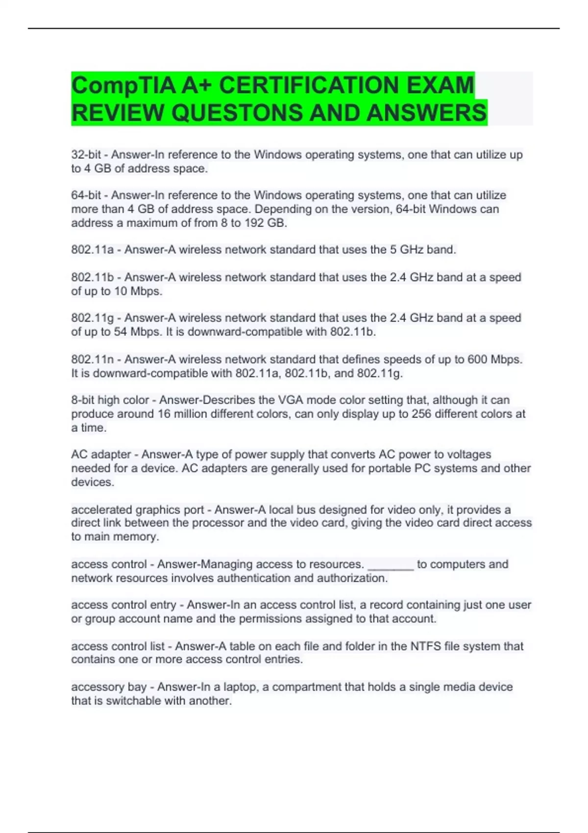 CompTIA A+ CERTIFICATION EXAM REVIEW QUESTONS AND ANSWERS archive attribute - Answer-A file attribute set by the OS when a file is created or modified. Backup software often removes this attribute when backing up a file in order to mark it as a backed-up file. arithmetic logic unit - Answer-A component of a CPU that is responsible for all logical and mathematical operations in the system. aspect ratio - Answer-The proportion between an image's width and height. Traditional CRT monitors have an aspect ratio of 4:3. Widescreen displays have an aspect ratio of 16:9. asymmetrical digital subscriber line - Answer-A type of DSL service in which the download speed is higher than the upload speed. asynchronous transfer mode - Answer-A type of switched network used by phone companies. ATA Packet Interface - Answer-The protocol for connecting optical drives and tape drives to an ATA channel. attended installation - Answer-An installation of Windows that is not automated, where the user is required to pay attention throughout the entire process to provide information and to respond to messages. Also called a manual installation. ATV12V - Answer-A power supply standard that has both the 20-pin connector for the motherboard and a 4-pin 12 V connector. ATX power supply - Answer-A power supply form factor that pairs with an ATX motherboard and case. audio modem riser - Answer-A small expansion card introduced in the late 1990s that plugs into a special slot on a motherboard and uses the CPU to perform modem functions and sound functions. It is not plug and play compatible.