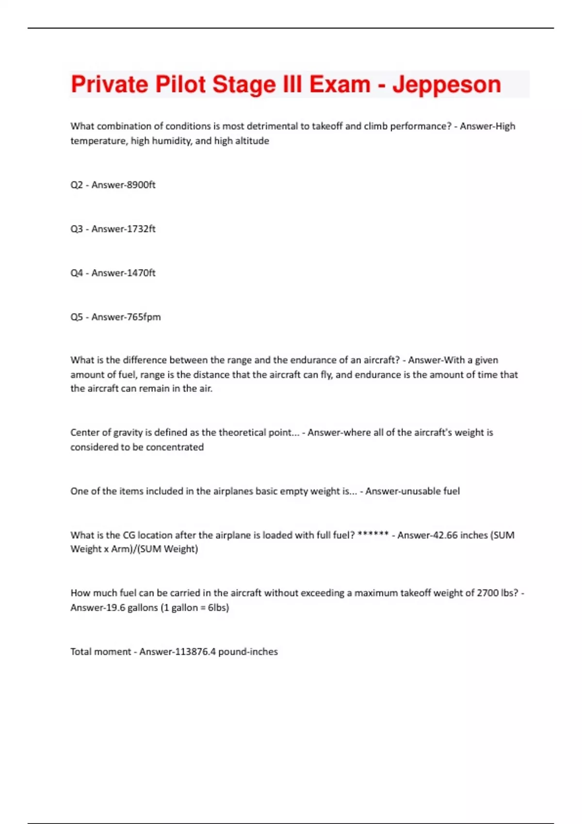 What combination of conditions is most detrimental to takeoff and climb performance? - Answer-High temperature, high humidity, and high altitude Q2 - Answer-8900ft Q3 - Answer-1732ft Q4 - Answer-1470ft Q5 - Answer-765fpm What is the difference between the range and the endurance of an aircraft? - Answer-With a given amount of fuel, range is the distance that the aircraft can fly, and endurance is the amount of time that the aircraft can remain in the air. Center of gravity is defined as the theoretical point... - Answer-where all of the aircraft's weight is considered to be concentrated One of the items included in the airplanes basic empty weight is... - Answer-unusable fuel What is the CG location after the airplane is loaded with full fuel? ****** - Answer-42.66 inches (SUM Weight x Arm)/(SUM Weight) How much fuel can be carried in the aircraft without exceeding a maximum takeoff weight of 2700 lbs? - Answer-19.6 gallons (1 gallon = 6lbs) Total moment - Answer-113876.4 pound-inchesAssume an aircraft has a total weight of 2,950 pounds and a total moment of 210,700 pound-inches. If the CG range is from 82.1 to 86.7 inches, what action, if any, should you take before you fly the aircraft? - Answer-Move some load aft in the aircraft Q13 - Answer-96.8 lb-inches Q14 - Answer-Within normal category limits but outside utility category limits The time-speed-distance function of your flight computer can be used to solve for - Answer-groundspeed and fuel consumption If your aircraft's fuel consumption rate is 5.6 g.p.h., how much fuel will it use on a flight of 230 n.m. with an average groundspeed of 93 knots? - Answer-13.8 gallons (Use E6-B) Determine the density altitude using the listed conditions - Answer-4097ft When you are flying an aircraft into a left-quartering headwind, what is the effect on groundspeed and wind correction angle if the wind velocity increases? - Answer-Groundspeed decreases, and wind correction increases. If you plan to save 30 minutes fuel for reserve, how far can you fly based on the listed conditions? - Answer-655 miles (Calculate total time first, then Calculate GS, then calculate distance) Compute the true heading and groundspeed for a cross-country flight based on the listed conditions - Answer-185 degrees and 106 knots Q21 - Answer-113 knots Q22 - Answer-30 degrees Q23******* - Answer-12.2 gallonsQ24 - Answer-193 degrees Q25 - Answer-4 degrees 45' E