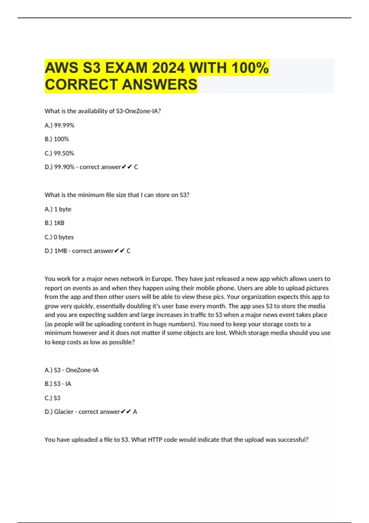 AWS S3 EXAM 2024 WITH 100% CORRECT ANSWERS What is the availability of S3-OneZone-IA? A.) 99.99% B.) 100% C.) 99.50% D.) 99.90% - correct answer C What is the minimum file size that I can store on S3? A.) 1 byte B.) 1KB C.) 0 bytes D.) 1MB - correct answer C You work for a major news network in Europe. They have just released a new app which allows users to report on events as and when they happen using their mobile phone. Users are able to upload pictures from the app and then other users will be able to view these pics. Your organization expects this app to grow very quickly, essentially doubling it's user base every month. The app uses S3 to store the media and you are expecting sudden and large increases in traffic to S3 when a major news event takes place (as people will be uploading content in huge numbers). You need to keep your storage costs to a minimum however and it does not matter if some objects are lost. Which storage media should you use to keep costs as low as possible? A.) S3 - OneZone-IA B.) S3 - IA C.) S3 D.) Glacier - correct answer A