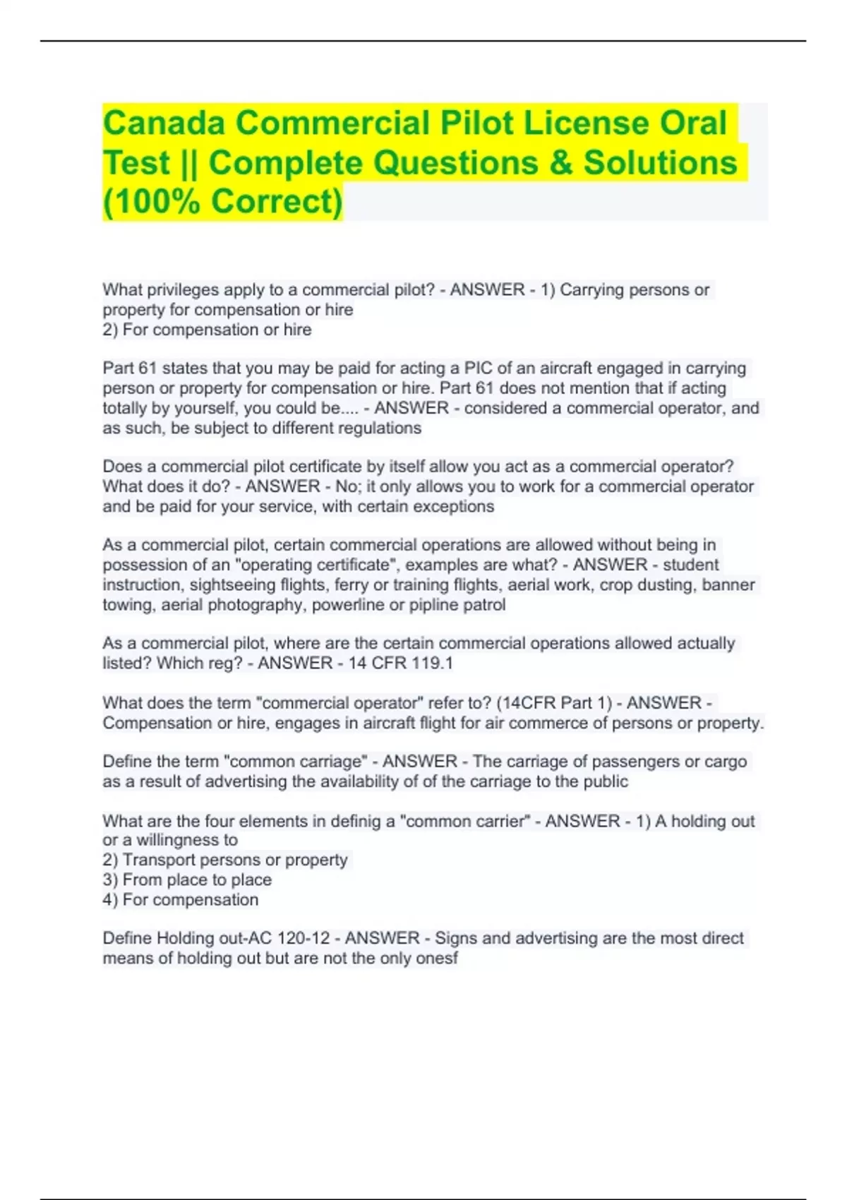 Canada Commercial Pilot License Oral Test || Complete Questions & Solutions (100% Correct) Canada Commercial Pilot License Oral Test || Complete Questions & Solutions (100% Correct) Canada Commercial Pilot License Oral Test || Complete Questions & Solutions (100% Correct) Canada Commercial Pilot License Oral Test || Complete Questions & Solutions (100% Correct) What privileges apply to a commercial pilot? - ANSWER - 1) Carrying persons or property for compensation or hire 2) For compensation or hire Part 61 states that you may be paid for acting a PIC of an aircraft engaged in carrying person or property for compensation or hire. Part 61 does not mention that if acting totally by yourself, you could be.... - ANSWER - considered a commercial operator, and as such, be subject to different regulations Does a commercial pilot certificate by itself allow you act as a commercial operator? What does it do? - ANSWER - No; it only allows you to work for a commercial operator