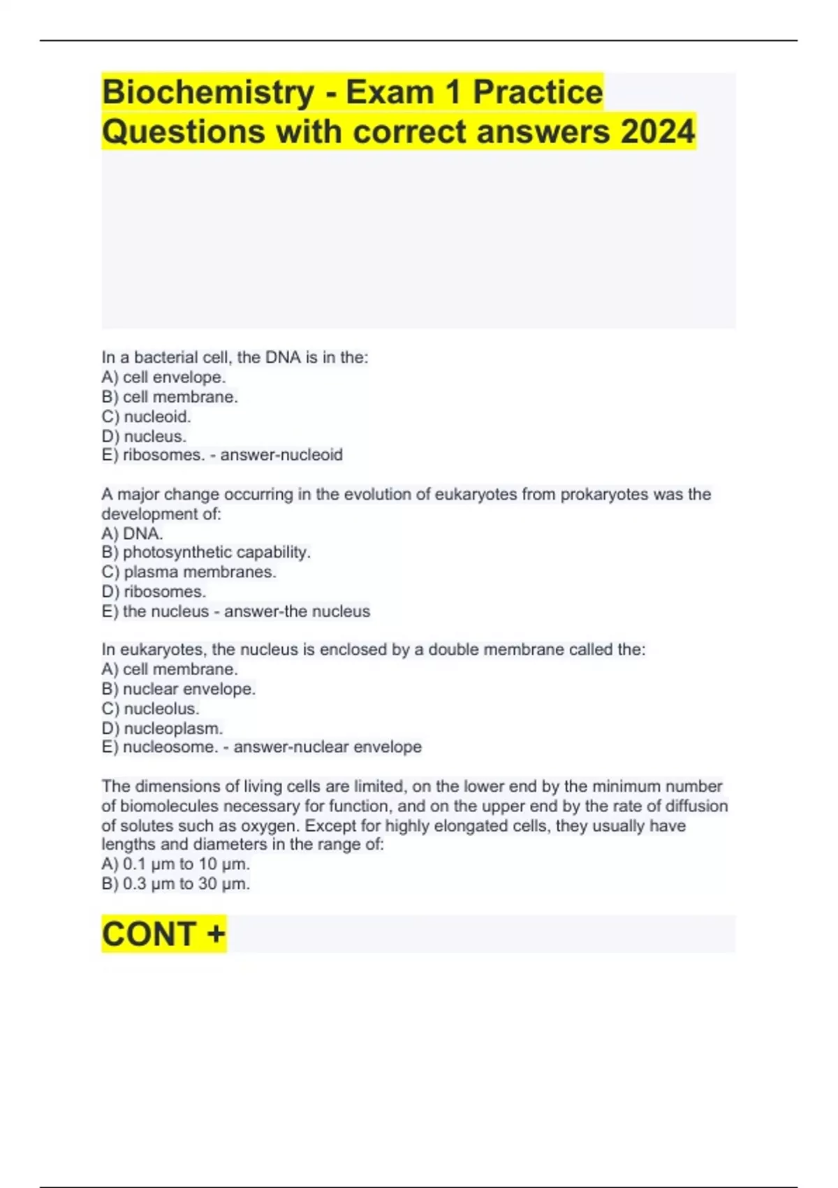 In a bacterial cell, the DNA is in the: A) cell envelope. B) cell membrane. C) nucleoid. D) nucleus. E) ribosomes. - answer-nucleoid A major change occurring in the evolution of eukaryotes from prokaryotes was the development of: A) DNA. B) photosynthetic capability. C) plasma membranes. D) ribosomes. E) the nucleus - answer-the nucleus In eukaryotes, the nucleus is enclosed by a double membrane called the: A) cell membrane. B) nuclear envelope. C) nucleolus. D) nucleoplasm. E) nucleosome. - answer-nuclear envelope The dimensions of living cells are limited, on the lower end by the minimum number of biomolecules necessary for function, and on the upper end by the rate of diffusion of solutes such as oxygen. Except for highly elongated cells, they usually have lengths and diameters in the range of: A) 0.1 µm to 10 µm. B) 0.3 µm to 30 µm. C) 0.3 µm to 100 µm. D) 1 µm to 100 µm. E) 1 µm to 300 µm - answer-0.3 µm to 100 µm The bacterium E. coli requires simple organic molecules for growth and energy—it is therefore a: A) chemoautotroph. B) chemoheterotroph. C) lithotroph. D) photoautotroph. E) photoheterotroph - answer-chemoheterotroph Which one of the following has the cellular components arranged in order of increasing size? A) Amino acid < protein < mitochondrion < ribosome B) Amino acid < protein < ribosome < mitochondrion C) Amino acid < ribosome < protein < mitochondrion D) Protein < amino acid < mitochondrion < ribosome E) Protein < ribosome < mitochondrion < amino acid - answer-Amino acid < protein < ribosome < mitochondrion The three-dimensional structure of macromolecules is formed and maintained primarily through noncovalent interactions. Which one of the following is not considered a noncovalent interaction? A) carbon-carbon bonds B) hydrogen bonds C) hydrophobic interactions D) ionic interactions E) van der Waals interactions - answer-carbon-carbon bonds Which one of the following is not among the four most abundant elements in living organisms? A) Carbon B) Hydrogen C) Nitrogen D) Oxygen E) Phosphorus - answer-Phosphorus The four covalent bonds in methane (CH4) are arranged around carbon to give which one of the following geometries? A) linear B) tetrahedral C) trigonal bipyramidal D) trigonal planar E) trigonal pyramidal - answer-tetrahedral The macromolecules that serve in the storage and transmission of genetic information are: A) carbohydrates. B) lipids. C) membranes. D) nucleic acids. E) proteins - answer-nucleic acids Stereoisomers that are nonsuperimposable mirror images of each other are known as: A) anomers. B) cis-trans isomers. C) diastereoisomers. D) enantiomers. E) geometric isomers - answer-enantiomers The enzyme fumarase catalyzes the reversible hydration of fumaric acid to l-malate, but it will not catalyze the hydration of maleic acid, the cis isomer of fumaric acid. This is an example of: A) biological activity. B) chiral activity. C) racemization. D) stereoisomerization. E) stereospecificity. - answer-stereospecificity Humans maintain a nearly constant level of hemoglobin by continually synthesizing and degrading it. This is an example of a(n): A) dynamic steady state. B) equilibrium state. C) exergonic change. D) free-energy change. E) waste of energy - answer-dynamic steady state If heat energy is absorbed by the system during a chemical reaction, the reaction is said to be: A) at equilibrium. B) endergonic. C) endothermic. D) exergonic. E) exothermic - answer-endothermic If the free energy change ∆G for a reaction is -46.11 kJ/mol, the reaction is: A) at equilibrium. B) endergonic. C) endothermic. D) exergonic. E) exothermic - answer-exergonic The major carrier of chemical energy in all cells is: A) acetyl triphosphate. B) adenosine monophosphate. C) adenosine triphosphate. D) cytosine tetraphosphate. E) uridine diphosphate - answer-adenosine triphosphate Enzymes are biological catalysts that enhance the rate of a reaction by: A) decreasing the activation energy. B) decreasing the amount of free energy released. C) increasing the activation energy. D) increasing the amount of free energy released. E) increasing the energy of the transition state - answer-decreasing the activation energy Energy requiring metabolic pathways that yield complex molecules from simpler precursors are: A) amphibolic. B) anabolic. C) autotrophic. D) catabolic. E) heterotrophic - answer-anabolic Hereditary information (with the exception of some viruses) is preserved in: A) deoxyribonucleic acid. B) membrane structures. C) nuclei. D) polysaccharides. E) ribonucleic acid. - answer-deoxyribonucleic acid When a region of DNA must be repaired by removing and replacing some of the nucleotides, what ensures that the new nucleotides are in the correct sequence? A) DNA cannot be repaired and this explains why mutations occur. B) Specific enzymes bind the correct nucleotides. C) The new nucleotides base-pair accurately with those on the complementary strand. D) The repair enzyme recognizes the removed nucleotide and brings in an identical one to replace it. E) The three-dimensional structure determines the order of nucleotides. - answer-The new nucleotides base-pair accurately with those on the complementary strand The three-dimensional structure of a protein is determined primarily by: A) electrostatic guidance from nucleic acid structure. B) how many amino acids are in the protein. C) hydrophobic interaction with lipids that provide a folding framework. D) modification during interactions with ribosomes. E) the sequence of amino acids in the protein. - answer-the sequence of amino acids in the protein According to Oparin's theory for the origin of life, the prebiotic atmosphere: A) already contained some primitive RNA molecules. B) basically was very similar to the atmosphere of today. C) contained many amino acids. D) had an abundance of methane, ammonia, and water. E) was rich in oxygen. - answer-had an abundance of methane, ammonia, and water What six characteristics d