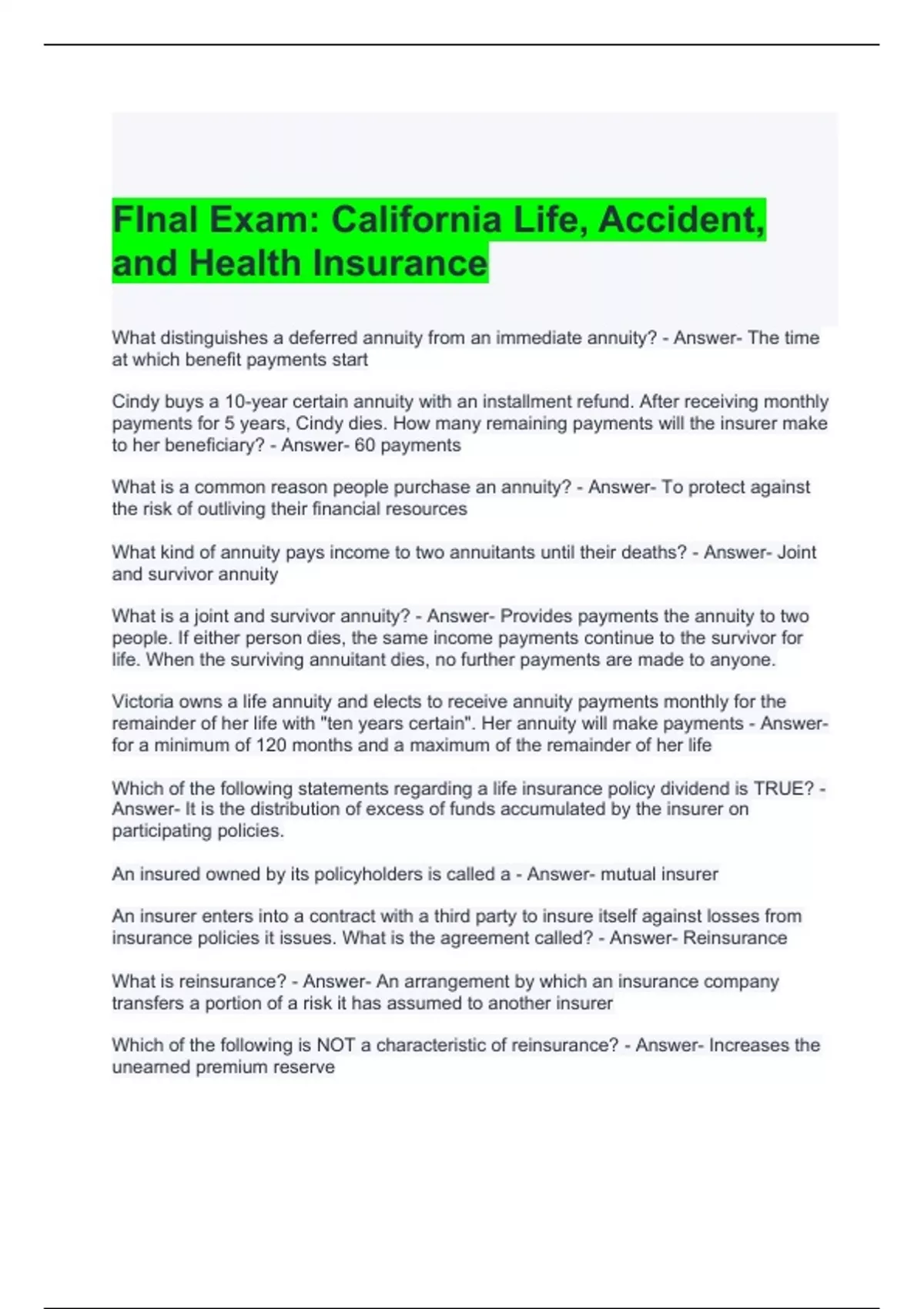 FInal Exam California Life, Accident, and Health Insurance Questions and Answers