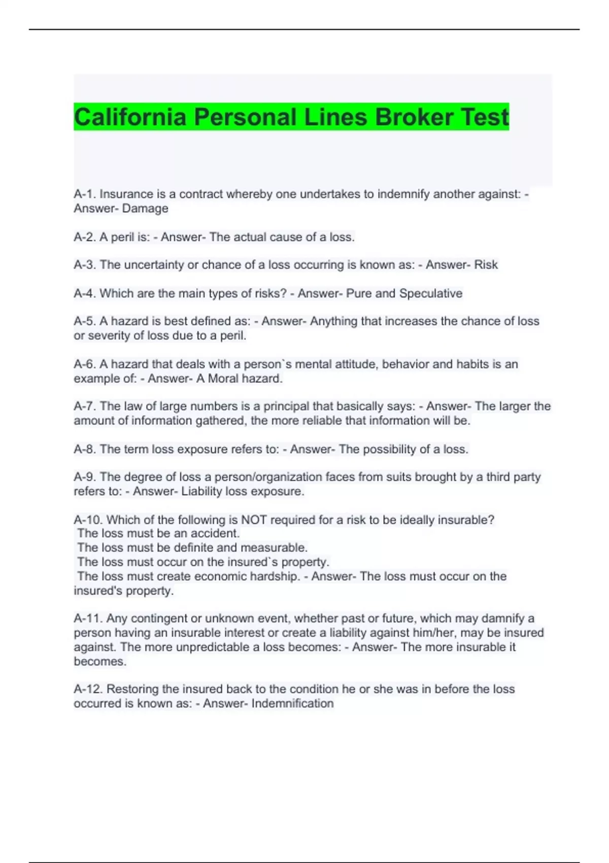 California Personal Lines Broker Test 100% solved
