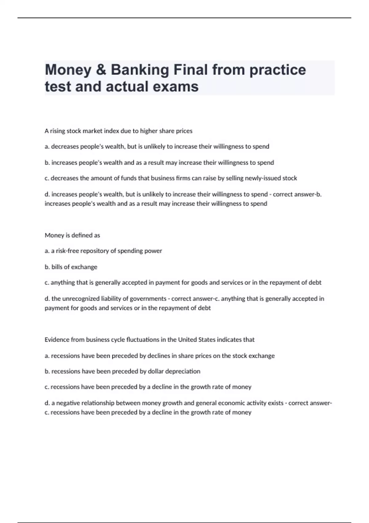 A rising stock market index due to higher share prices a. decreases people's wealth, but is unlikely to increase their willingness to spend b. increases people's wealth and as a result may increase their willingness to spend c. decreases the amount of funds that business firms can raise by selling newly-issued stock d. increases people's wealth, but is unlikely to increase their willingness to spend - correct answer-b. increases people's wealth and as a result may increase their willingness to spend Money is defined as a. a risk-free repository of spending power b. bills of exchange c. anything that is generally accepted in payment for goods and services or in the repayment of debt d. the unrecognized liability of governments - correct answer-c. anything that is generally accepted in payment for goods and services or in the repayment of debt Evidence from business cycle fluctuations in the United States indicates that a. recessions have been preceded by declines in share prices on the stock exchange b. recessions have been preceded by dollar depreciation c. recessions have been preceded by a decline in the growth rate of money d. a negative relationship between money growth and general economic activity exists - correct answer-c. recessions have been preceded by a decline in the growth rate of money Every financial market has the following characteristic: a. it allows loans to be made b. it channels funds from lenders-savers to borrowers-spenders c. it allows common stock to be traded