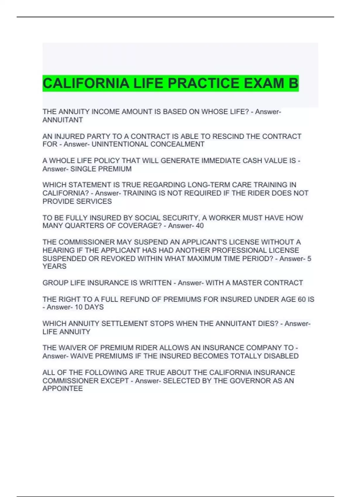 CALIFORNIA LIFE PRACTICE EXAM B 2024 -GRADED A