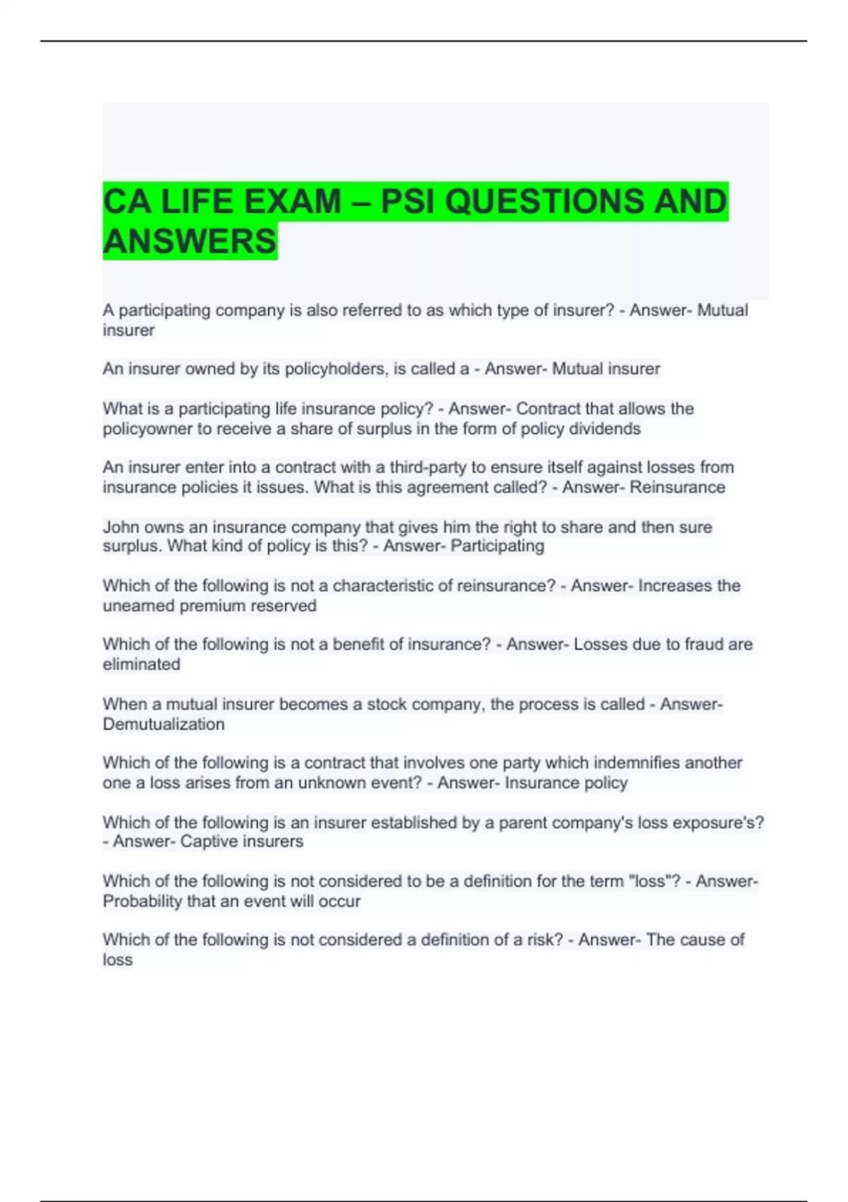 CA LIFE EXAM – PSI QUESTIONS AND ANSWERS