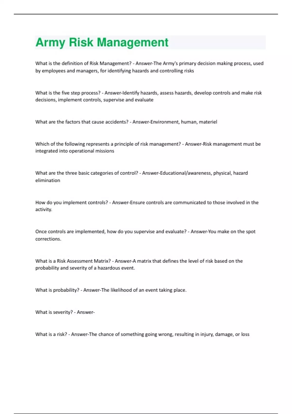 Army Risk Management Questions And Answers Solved 100% Correct!!