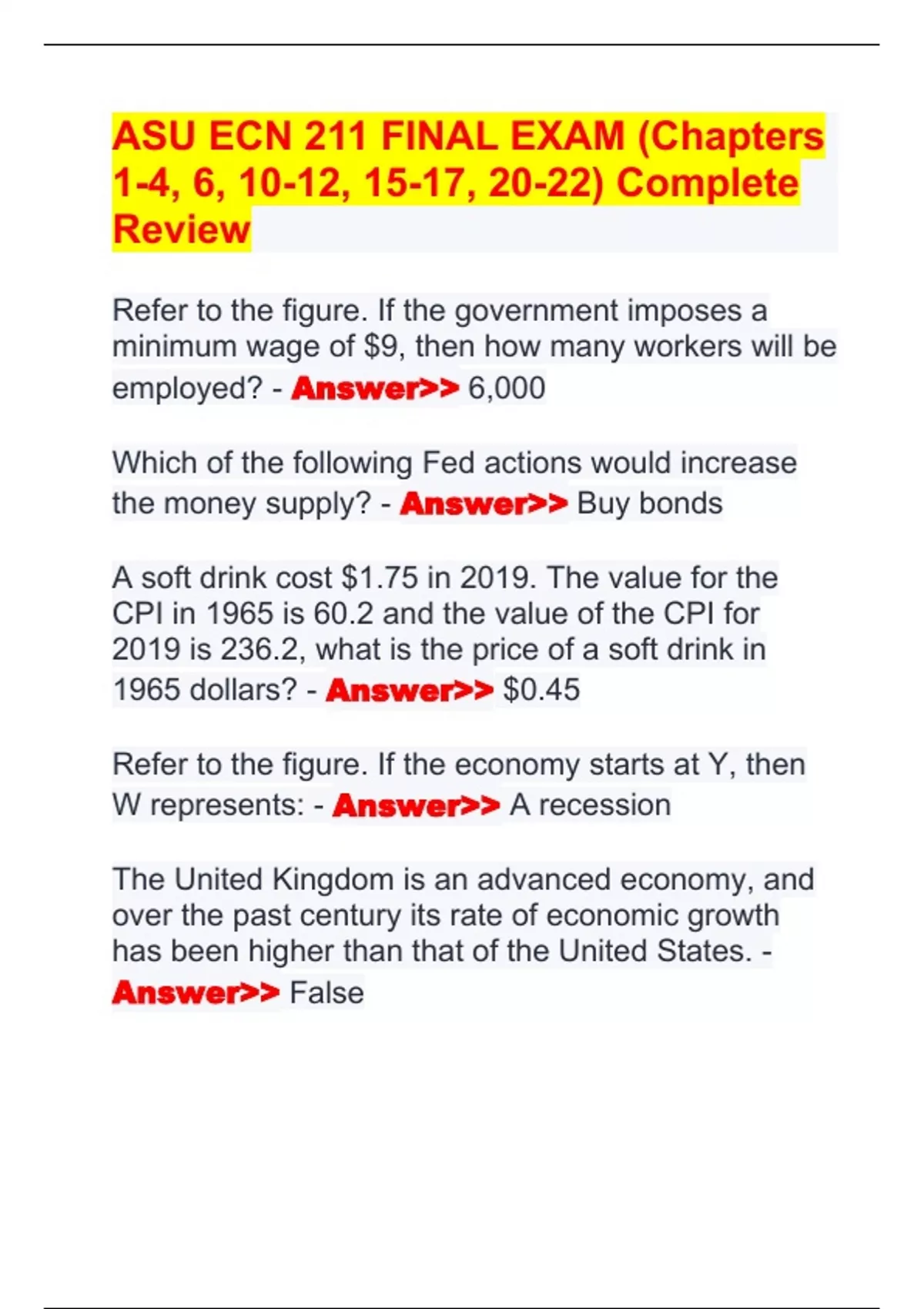 ASU ECN 211 FINAL EXAM (Chapters 1-4, 6, 10-12, 15-17, 20-22) Complete Review