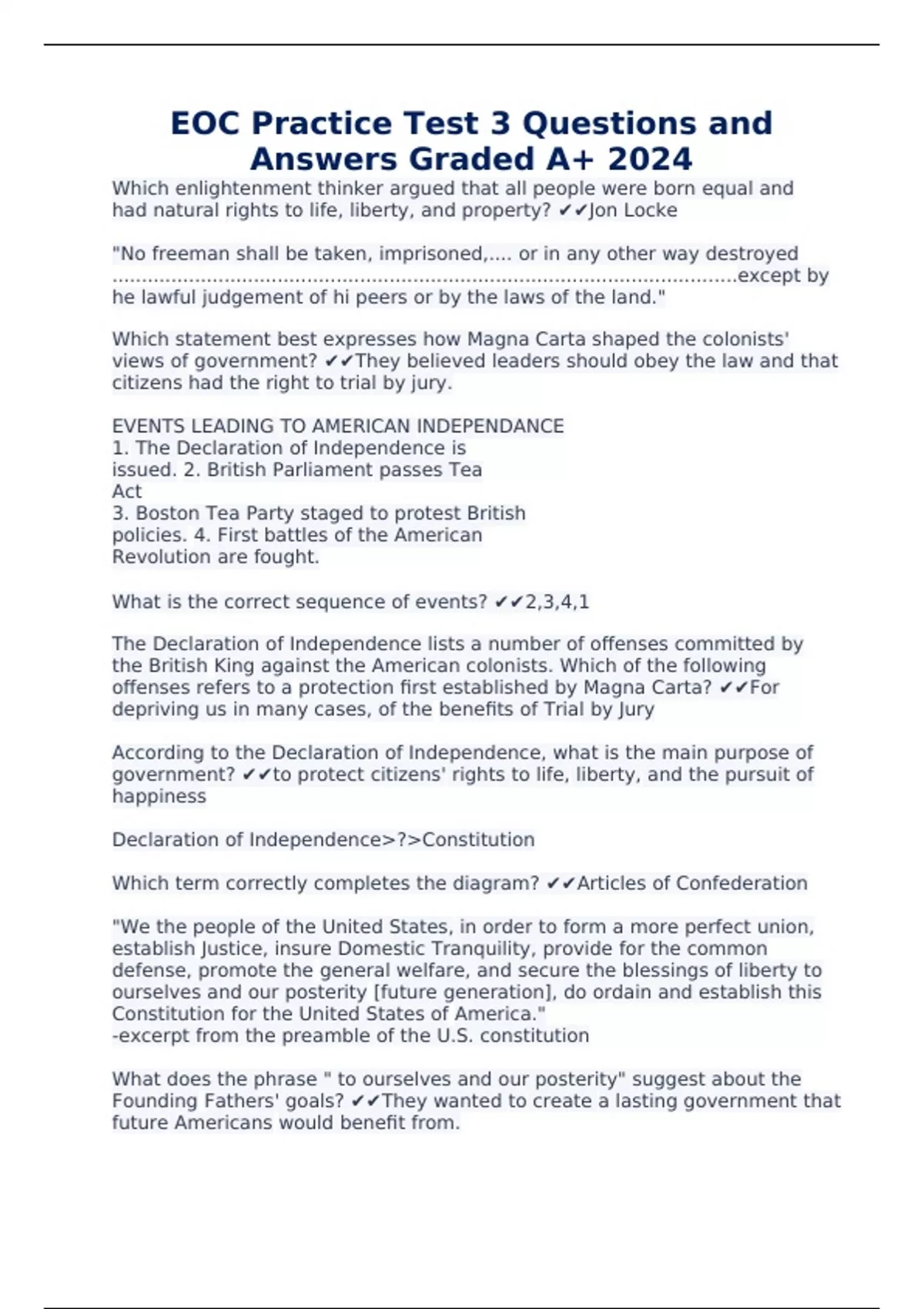 EOC Practice Test 3 Questions and Answers Graded A+ 2024 Which enlightenment thinker argued that all people were born equal and had natural rights to life, liberty, and property? Jon Locke