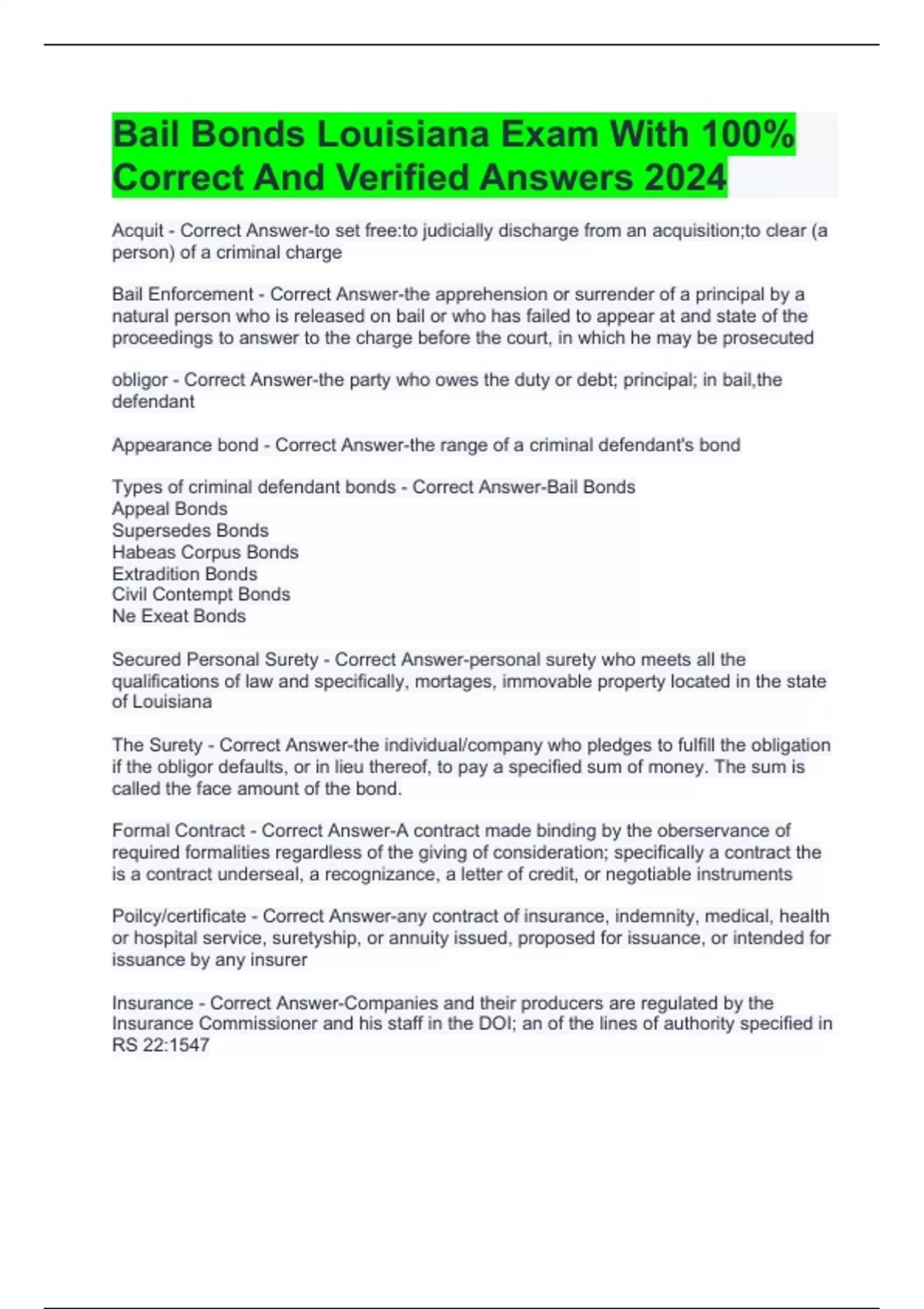 Bail Bonds Louisiana Exam With 100% Correct And Verified Answers 2024 Acquit - Correct Answer-to set free:to judicially discharge from an acquisition;to clear (a person) of a criminal charge Bail Enforcement - Correct Answer-the apprehension or surrender of a principal by a natural person who is released on bail or who has failed to appear at and state of the proceedings to answer to the charge before the court, in which he may be prosecuted obligor - Correct Answer-the party who owes the duty or debt; principal; in bail,the defendant Appearance bond - Correct Answer-the range of a criminal defendant's bond Types of criminal defendant bonds - Correct Answer-Bail Bonds Appeal Bonds Supersedes Bonds Habeas Corpus Bonds Extradition Bonds Civil Contempt Bonds Ne Exeat Bonds Secured Personal Surety - Correct Answer-personal surety who meets all the qualifications of law and specifically, mortages, immovable property located in the state of Louisiana The Surety - Correct Answer-the individual/company who pledges to fulfill the obligation if the obligor defaults, or in lieu thereof, to pay a specified sum of money. The sum is called the face amount of the bond. Formal Contract - Correct Answer-A contract made binding by the oberservance of required formalities regardless of the giving of consideration; specifically a contract the is a contract underseal, a recognizance, a letter of credit, or negotiable instruments Poilcy/certificate - Correct Answer-any contract of insurance, indemnity, medical, health or hospital service, suretyship, or annuity issued, proposed for issuance, or intended for issuance by any insurer Insurance - Correct Answer-Companies and their producers are regulated by the Insurance Commissioner and his staff in the DOI; an of the lines of authority specified in RS 22:1547 Bail - Correct Answer-Monetary or other form of security to insure the appearance of the defendant at every stage of the criminal proceedings; any type of pretrial release Probable Cause - Correct Answer-Facts sufficient to cause a person of reasonable caution to believe a crime has been committed and if applicable that a specific person has committed the crime 2 types of personal surety - Correct Answer-Unsecured and Secured Voluntarily Surrender - Correct Answer-personal appearance without confinement by a law enforcement officer or bail recovery agent Surety - Correct Answer-One who undertakes to pay money or perform some act if the principal fails to pay or perform Producer - Correct Answer-A person required to be licensed under the laws of this state to sell, solicit, or negotiate insurance, and includes all persons or business entities otherwise referred to in the La. Insurance code False Swearing - Correct Answer-when a person tells a lie under oath,and it is put in writing and sworn before a notary or other such official Waiver - Correct Answer-implies giving up of a known right Offer & Acceptance - Correct Answer-one party must take a proposition to the other and the other must accept the proposal Competent Parties - Correct Answer-sometimes referred to as "sui juris" parties The parties must be legal age and in no way mentally impaired Breach of Contract - Correct Answer-One party's failure to perform some act, which be contractually agreed to do. In addition the aggrieved party may ask for monetary damages under a suit Unilateral Contract - Correct Answer-A contract in which only one party is obligated to perform. Compare to bilateral contracts Contract - Correct Answer-an agreement between 2 or more persons which is legally binding Informal Contract - Correct Answer-Any contract that is not formal contract. Also called simple contract Bilateral Contract - Correct Answer-A contract in which both parties have promised to perform.