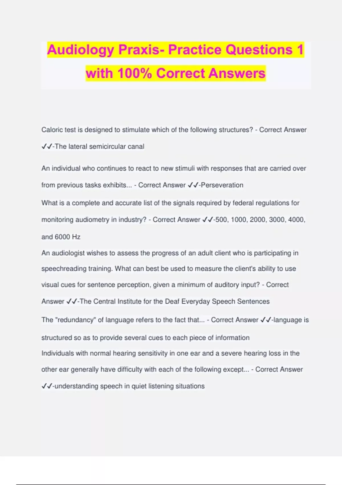 Audiology Praxis- Practice Questions 1 with 100% Correct Answers Caloric test is designed to stimulate which of the following structures? - Correct Answer ️️ -The lateral semicircular canal An individual who continues to react to new stimuli with responses that are carried over from previous tasks exhibits... - Correct Answer ️️ -Perseveration What is a complete and accurate list of the signals required by federal regulations for monitoring audiometry in industry? - Correct Answer ️️ -500, 1000, 2000, 3000, 4000, and 6000 Hz An audiologist wishes to assess the progress of an adult client who is participating in speechreading training. What can best be used to measure the client's ability to use visual cues for sentence perception, given a minimum of auditory input? - Correct Answer ️️ -The Central Institute for the Deaf Everyday Speech Sentences The "redundancy" of language refers to the fact that... - Correct Answer ️️ -language is structured so as to provide several cues to each piece of information Individuals with normal hearing sensitivity in one ear and a severe hearing loss in the other ear generally have difficulty with each of the following except... - Correct Answer ️️ -understanding speech in quiet listening situations For live-voice presentations of the Word Intelligibility by Picture Identification (WIPI), a 4-year-old child with severe bilateral hearing loss obtains a score of 32 percent on the right ear and 40 percent on the left ear. On the basis of these findings, the audiologist should logically conclude that... - Correct Answer ️️ -scores may reflect, in part, a delay in the child's language development Which of the following would be more likely to ensure that the proper ratio of clients to clinicians in an audiology clinic - Correct Answer ️️ -Accumulating data regarding numbers of clients, complexity of clients' service needs, and contact hours over an extended period of time The observation of a prolonged interval between waves I and V would be consistent with which of the following? - Correct Answer ️️ -Retrocochlear pathology, such as an acoustic neuroma A common strategy for selecting hearing-aid gain involves the "half-gain" rule. This rule specifies hat gain should be equal to one half of the... - Correct Answer ️️ -hearing loss in dB HL What is the conductive component if the AC is 50 dB and the BC is 30 dB? - Correct Answer ️️ -20 dB If the AC thresholds are: 25, 35, 50, 65, 65, and 70 dB, what is the estimated SRT? - Correct Answer ️️ -50 dB What is an accurate statement concerning measures of speech reading ability? - Correct Answer ️️ -The most realistic measures of speechreading are administered in a combined visual-auditory mode In the adult rehabilitation process, part of the strategy includes listening training, which means that the adult is trained to... - Correct Answer ️️ -be alert, attentive, and set to receive communication A six-month-old infant has recently been identified as having a severe bilateral sensorineural hearing impairment of unknown etiology. The parents should be referred for what as a matter of routine? - Correct Answer ️️ -Genetic evaluation Hearing conservation programs for children often include screening with pure tones and acoustic immittance measures, whereas programs for adults will likely use only pure tones for screening. What justifies this difference? - Correct Answer ️️ -There is a significantly higher incidence of middle-ear pathology among children than among adults What is true of the occlusion effect? - Correct Answer ️️ -It can affect the measurement of the bone-conduction threshold at low frequencies Narrow bands of noise available on diagnostic audiometers for the masking of pure tones are usually 1/3 octave in width because bands of that width... - Correct Answer ️️ -encompass the width of a critical band It is important to consider the conceptional age of an infant, rather than the chronological age when interpreting what? - Correct Answer ️️ -ABR Wave V latencies For a fixed setting of the hearing-level dial of a pure-tone audiometer, which of the following is true of the actual sound pressure level (SPL) output of the audiometer earphone? - Correct Answer ️️ -It is lowest at midfrequencies In the early stages of Menieres disease, when there is an increase in the amount of endolymph in the inner ear, there is also a characteristic sensorineural hearing loss that primarily affects what? - Correct Answer ️️ -250-2000 Hz In the sound field, an audiologist measures 30 dB SPL at a distance of 10 meters from the sources. Assuming no change in sound source or field conditions, at 20 meters from the sound, the dB SPL will be... - Correct Answer ️️ -24 dB Children who experience recurrent otitis media with effusion early in life are generally considered... - Correct Answer ️️ -at risk for academic difficulties What earmold modification will not enhance the high-frequency response of a hearing aid, as measured in the ear canal? - Correct Answer ️️ -A bore with a stepped-down diameter What is the reason investigators have given for limiting a hearing aid's SSPL-90 to a lower level when it is worn by a child than when it is worn by an adult? - Correct Answer ️️ -The volume of the external auditory meatus in children is less than that represented by a 2-cc coupler, and consequently the SPL at the eardrum is greater What evaluation measure is most likely to provide valid and reliable information about the hearing sensitivity of a 9 month old child at 500 and 4000 Hz? - Correct Answer ️️ - VRA In the measurement of real-ear sound-pressure levels with a probe tube microphone system, insufficient probe-tube depth will tend to... - Correct Answer ️️ -decrease the high-frequency response In counseling of parents of a child with a newly identified hearing loss, the audiologist should do what? - Correct Answer ️️ -Assum
