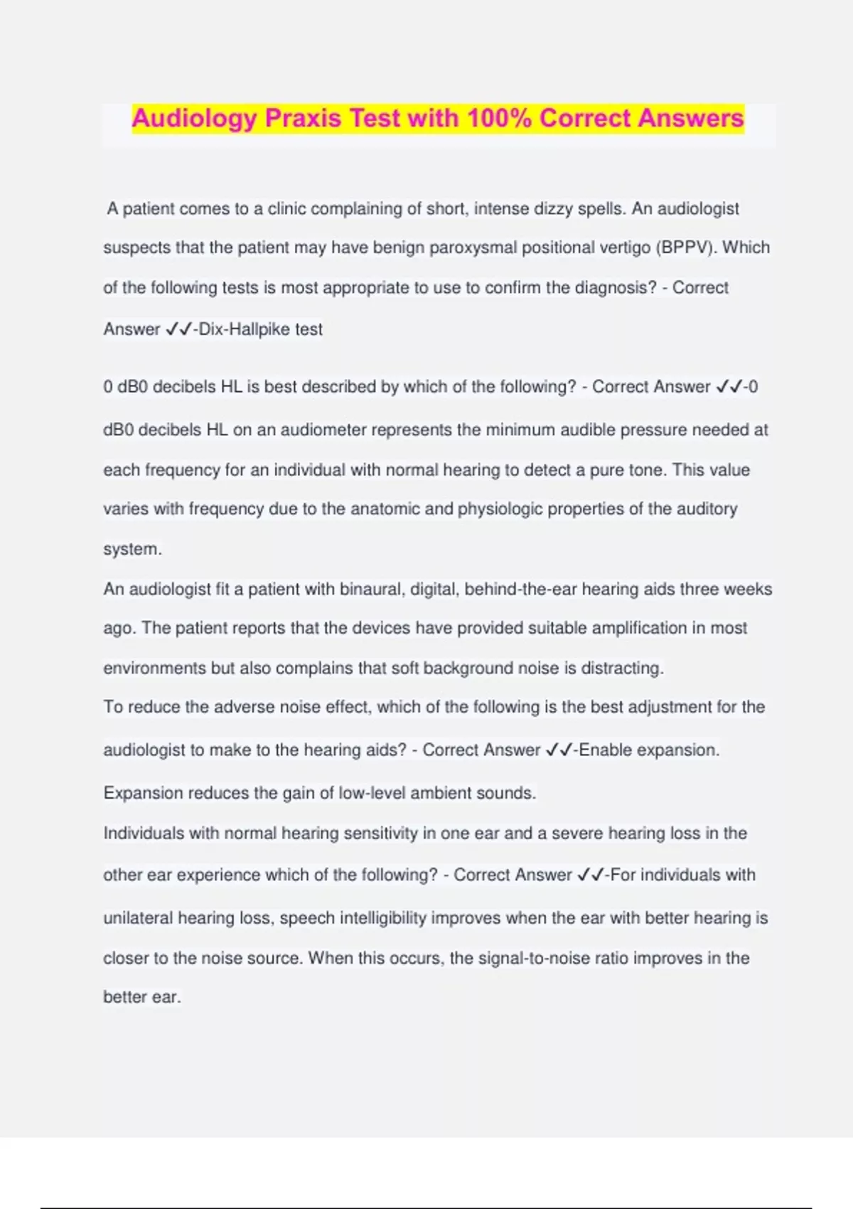 Audiology Praxis Test with 100% Correct Answers A patient comes to a clinic complaining of short, intense dizzy spells. An audiologist suspects that the patient may have benign paroxysmal positional vertigo (BPPV). Which of the following tests is most appropriate to use to confirm the diagnosis? - Correct Answer ️️ -Dix-Hallpike test 0 dB0 decibels HL is best described by which of the following? - Correct Answer ️️ -0 dB0 decibels HL on an audiometer represents the minimum audible pressure needed at each frequency for an individual with normal hearing to detect a pure tone. This value varies with frequency due to the anatomic and physiologic properties of the auditory system. An audiologist fit a patient with binaural, digital, behind-the-ear hearing aids three weeks ago. The patient reports that the devices have provided suitable amplification in most environments but also complains that soft background noise is distracting. To reduce the adverse noise effect, which of the following is the best adjustment for the audiologist to make to the hearing aids? - Correct Answer ️️ -Enable expansion. Expansion reduces the gain of low-level ambient sounds. Individuals with normal hearing sensitivity in one ear and a severe hearing loss in the other ear experience which of the following? - Correct Answer ️️ -For individuals with unilateral hearing loss, speech intelligibility improves when the ear with better hearing is closer to the noise source. When this occurs, the signal-to-noise ratio improves in the better ear. A patient is seen for a vestibular evaluation with the primary complaint of persistent imbalance for the past six months. The patient reports one severe attack of true rotary vertigo six months ago and since then fears that another will occur. The patient has limited many activities because quick head movements increase symptoms. Videonystagmography (VNG) results indicate normal saccade, optokinetic, and smooth pursuit testing. A left-beating nystagmus is observed during gaze testing without fixation. Post-headshake nystagmus reveals a left-beating nystagmus. No positioning or positional nystagmus is observed. Bilateral bithermal caloric test results indicate a 50 percent right weakness with no significant directional preponderance. Based on the preceding information, the patient most likely has which of the following? - Correct Answer ️️ -Videonystagmography (VNG) results normally provide site-of-lesion specific information to determine the probable side of weakness. In this example, the patient had a 50 percent right peripheral vestibular weakness, suggesting a peripheral pathology affecting the right side. The post-headshake left-beating nystagmus suggests that the lesion is dynamically uncompensated. Research shows that people wait as long as seven years before they seek hearing health care services due to the negative stigma associated with hearing loss. Which of the following is most likely to occur with untreated hearing loss? - Correct Answer ️️ - The consequences of untreated hearing loss include lower signal quality in the brain (leading to a higher cognitive load), a change in the structure of the brain, social disengagement, behavior changes, and health issues like dementia, depression, fatigue, and anxiety. A 65-year-old woman is fitted with her first pair of hearing aids. She and her husband are attending their first audiologic rehabilitation session about communication strategies. She states that she struggles to understand what her husband says "because he uses too many words." Which of the following facilitative strategies would be the most appropriate to improve the situation? - Correct Answer ️️ -Ask the partner to talk in short phrases and take pauses. She should use a message-tailoring strategy that teaches her communication partner to use simple syntax and multiple shorter phrases rather than one longer one. A patient with new hearing aids complains of difficulty understanding speech in noisy environments such as restaurants. The audiologist verifies that the cardioid polar plots with fixed directionality are working appropriately. Which of the following is the most appropriate action for the audiologist to take when counseling the patient? - Correct Answer ️️ -Counseling patients about where to sit in noisy environments will maximize the capability of the directionality feature of the hearing aids. Cardioid microphones in hearing aids pick up sounds with sensitivity from the front and sides but poorly from the rear. It is therefore best to sit or stand with the back to the noise that is interfering with hearing and let the sound come from the front or sides. A 5-year-old child was recently diagnosed with a bilateral, moderately severe sensorineural hearing loss after a bout of meningitis. She had typically developing speech and language before her illness but now has significant difficulty communicating because of her hearing loss. She also has other comorbidities as a result of the meningitis. Knowledge of which of the following would assist other professionals who are working with this child? - Correct Answer ️️ -Use of communication strategies. Knowledge and application of repair and facilitative strategies would assist interprofessional practice Which TWO of the following are accurate statements concerning assessment measures of speechreading ability? - Correct Answer ️️ -Speechreading tests are difficult to administer and assess because of intertalker differences and lack of naturalness. The most realistic measures of speechreading ability are administered in a combined auditory-visual mode. Option (B) is correct because intertalker differences are difficult to control for consistency in speechreading assessments. Option (D) is correct because speechreading in actual use depends on both auditory and visual input for most clients. The measure of speechreading ability that best reflects a client's real ability is one t