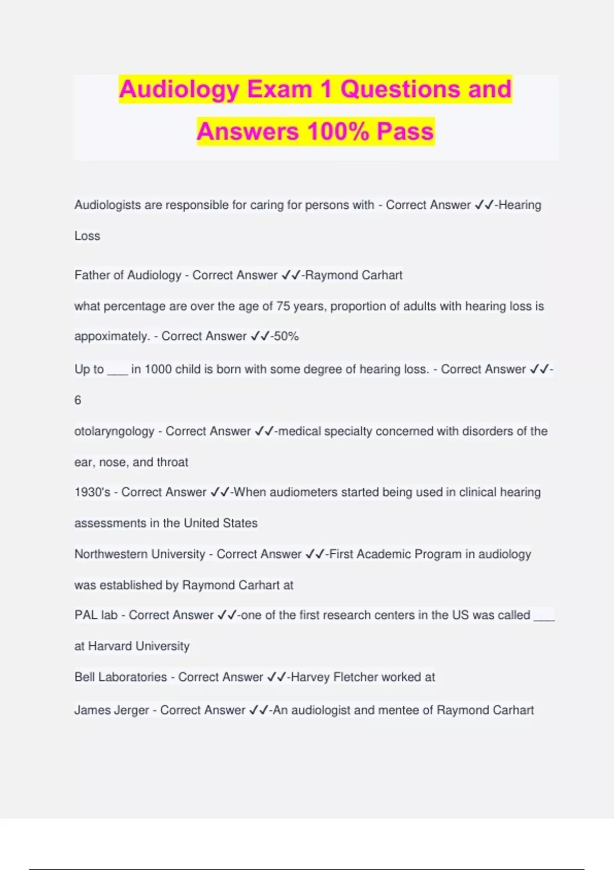 Audiology Exam 1 Questions and Answers 100% Pass Audiologists are responsible for caring for persons with - Correct Answer ️️ -Hearing Loss Father of Audiology - Correct Answer ️️ -Raymond Carhart what percentage are over the age of 75 years, proportion of adults with hearing loss is appoximately. - Correct Answer ️️ -50% Up to ___ in 1000 child is born with some degree of hearing loss. - Correct Answer ️️ - 6 otolaryngology - Correct Answer ️️ -medical specialty concerned with disorders of the ear, nose, and throat 1930's - Correct Answer ️️ -When audiometers started being used in clinical hearing assessments in the United States Northwestern University - Correct Answer ️️ -First Academic Program in audiology was established by Raymond Carhart at PAL lab - Correct Answer ️️ -one of the first research centers in the US was called ___ at Harvard University Bell Laboratories - Correct Answer ️️ -Harvey Fletcher worked at James Jerger - Correct Answer ️️ -An audiologist and mentee of Raymond Carhart 1970s - Correct Answer ️️ -when Audiologists started becoming involved in the fitting and dispensing of hearing aids in the Clinical Scholar - Correct Answer ️️ -A professional who has expertise in providing patient services along with research education and experience is termed a Rehabilitative Audiologist - Correct Answer ️️ -Audiologists who choose to work with manufacturers of hearing aids and related equipment are called Audiologists are non-physician healthcare professionals who treat hearing loss with techniques other than medicine or surgery. - Correct Answer ️️ -True Which of the following is a true specialty area in audiology a. Pediatric audiology b. Hearing testing c. Working in a medical clinic d. PhD audiology - Correct Answer ️️ -Pediatric Audiology The description of activities that can be included in clinical practice is known as the a. Code of Ethics b. Licensure Board c. American Board of Audiology D. Scope of Practice - Correct Answer ️️ -Code of Ethics Which organization, in 1988, was formed "of, by, and for audiologists"? a. American Speech-Language-Hearing Association b. American Otology Association c. American Academy of Audiology d. Ear Institute - Correct Answer ️️ -American Academy of Audiology According to the American Academy of Audiology 2011 Compensation and Benefits Report, which setting employs the highest percentage of audiologists? a. Veterans Administration b. Otolaryngology practice c. Private practice d. University hospital - Correct Answer ️️ -Private Practice During which historical event was audiology conceived as a profession? - Correct Answer ️️ -WWII Who won the Nobel Prize in Physiology or Medicine for his work on the physiology of the ear? - Correct Answer ️️ -George von Beksy Which audiologist whose work has focused on newborn and pediatric hearing is also called the Mother of Audiology? - Correct Answer ️️ -Marion Downs What is the current entry-level degree for the practice of audiolo