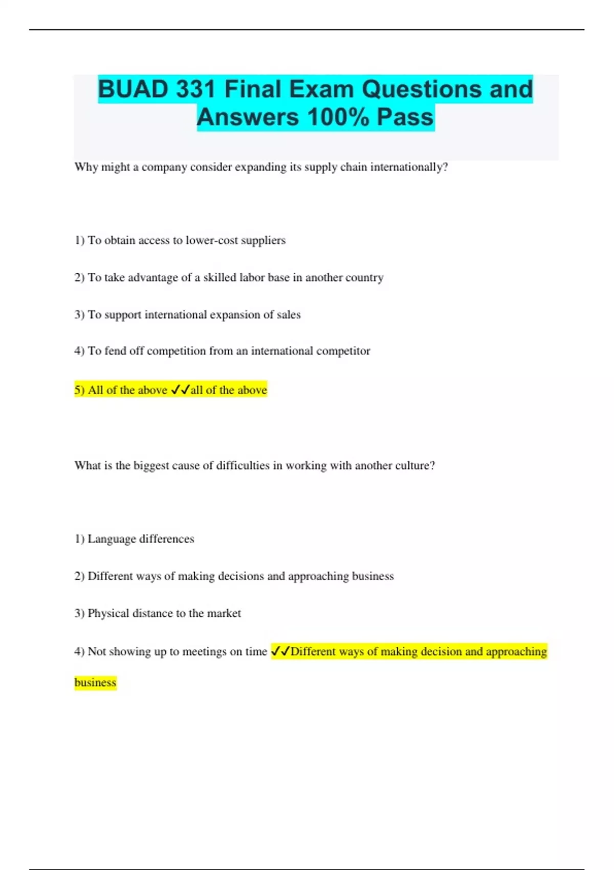 BUAD 331 Final Exam Questions and Answers 100% Pass Why might a company consider expanding its supply chain internationally? 1) To obtain access to lower-cost suppliers 2) To take advantage of a skilled labor base in another country 3) To support international expansion of sales 4) To fend off competition from an international competitor 5) All of the above all of the above What is the biggest cause of difficulties in working with another culture? 1) Language differences 2) Different ways of making decisions and approaching business 3) Physical distance to the market 4) Not showing up to meetings on time Different ways of making decision and approaching business Which supply chain strategy is most popular with companies today? 1) Purely global manufacturing with very few global production locations 2) Purely local manufacturing with production in every market 3) Regional strategy that groups countries into clusters 4) High-tech strategy that uses software to overcome the problems regional strategy that groups countries into clusters What is the most common way that countries agree to increase trade? 1) Through unilateral removal of tariffs on imports 2) Through the GATT treaty agreement 3) Through WTO negotiations 4) Through negotiating bilateral or multilateral FTAs Through negotiating bilateral or multilateral FTAs When was the World Trade Organization founded? 1785 1895 1905 The legal system used in the United States is based on: Napoleonic law common law civil law code law common law Supply chain management has a widely accepted definition that does not vary substantially between countries. True False false Which framework is most useful for companies wanting to build an initial assessment of the general operating environment in a country? EPIC CAGE SWOT FARM EPIC What events can result in a supply chain disruption? Natural disasters like floods Supplier bankruptcy Plant fire at a supplier All of the above all of the